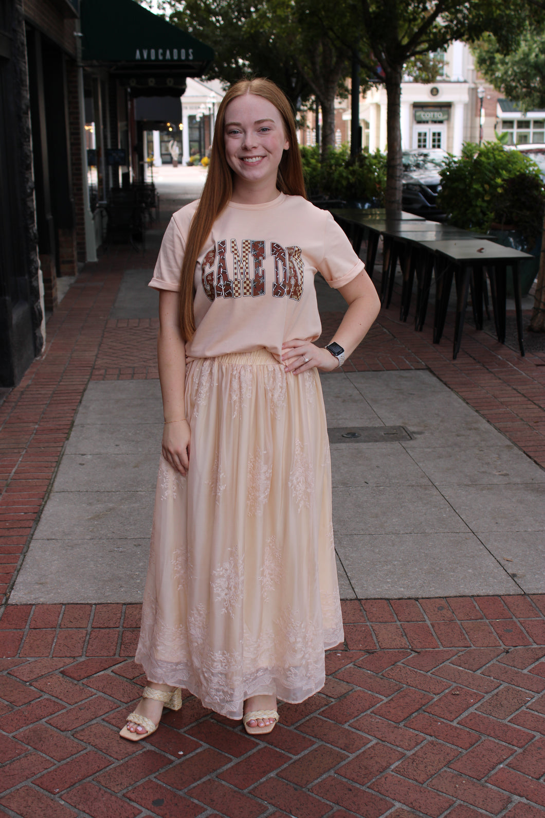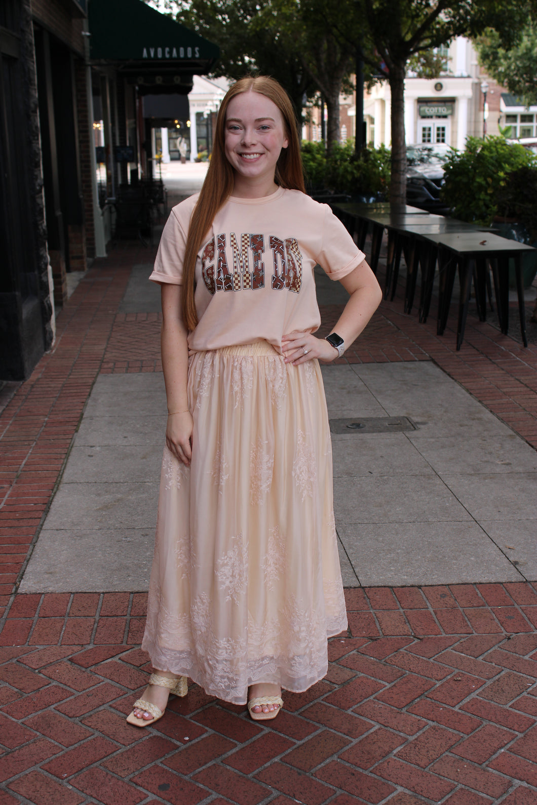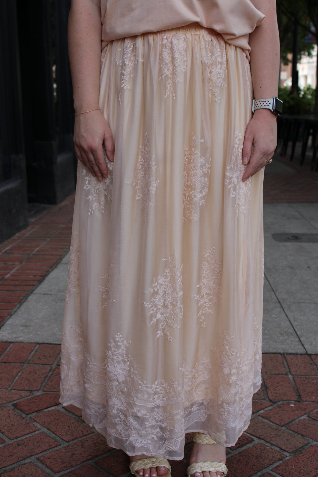 Ivory Over Lace Skirt With Embroidery. Elastic Waist Lined Skirt
