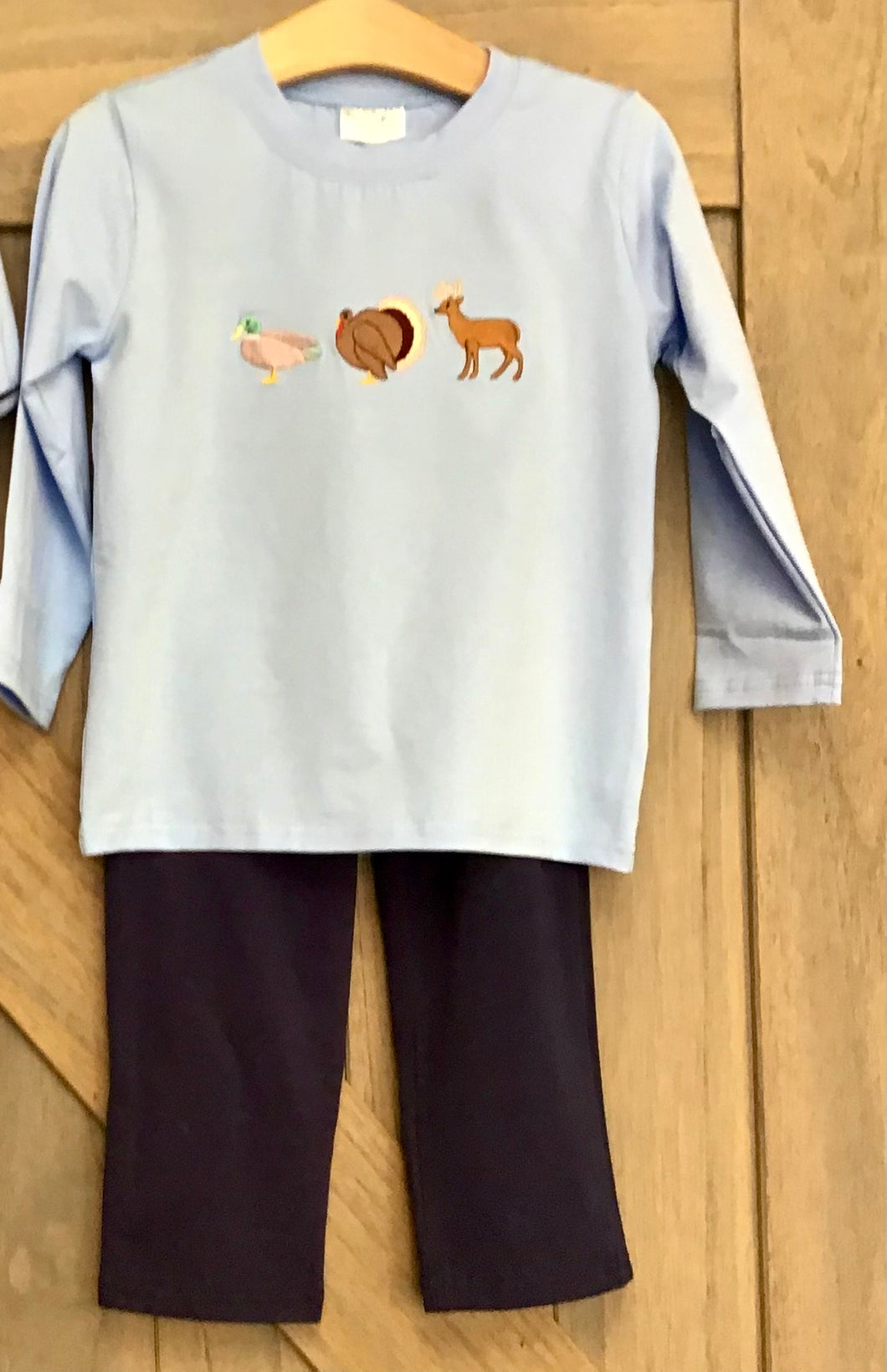 Blue LS Shirt with Embroidered Mallard ,Turkey and Deer Shirt with Navy Pants