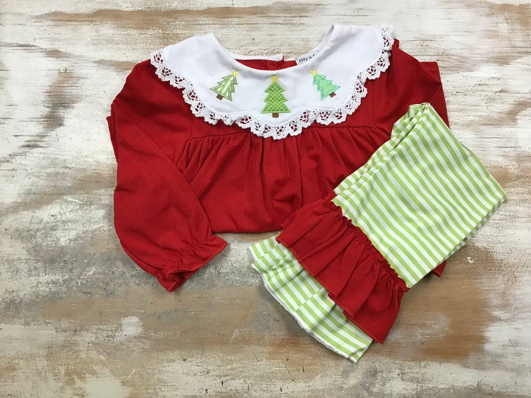 Red Long Sleeve With Christmas Tree Embroidered Collar. Green Striped Ruffled Pants