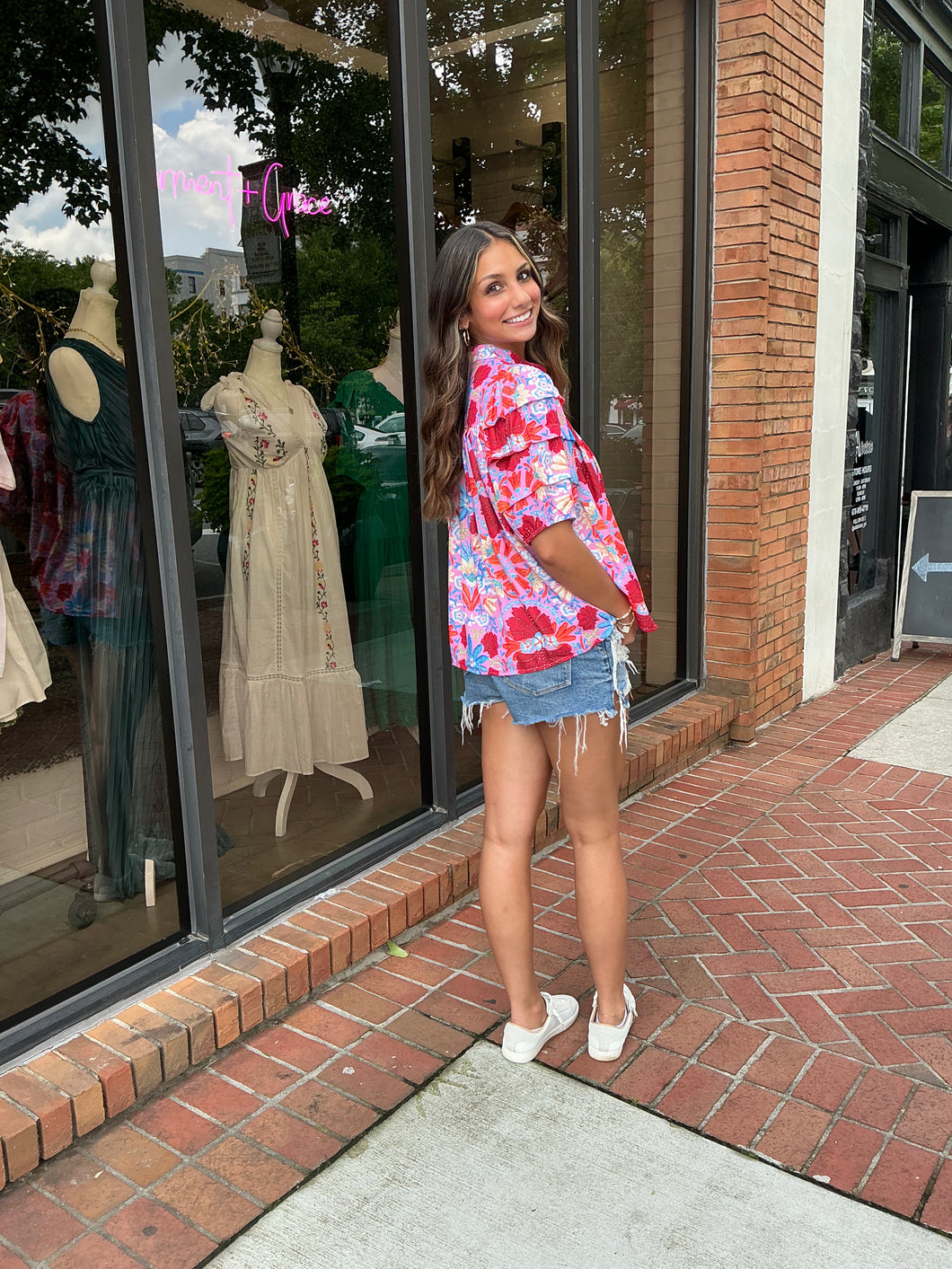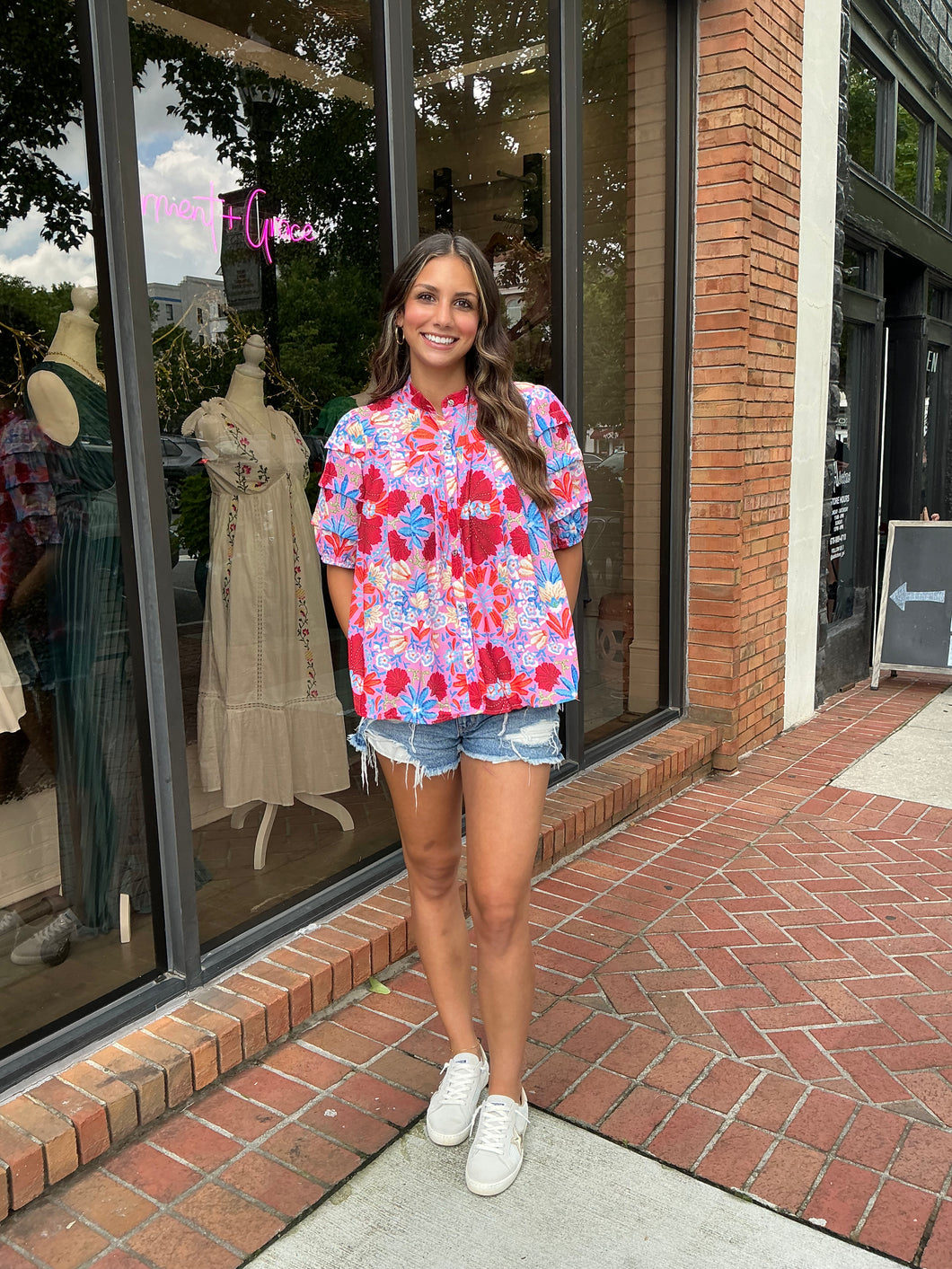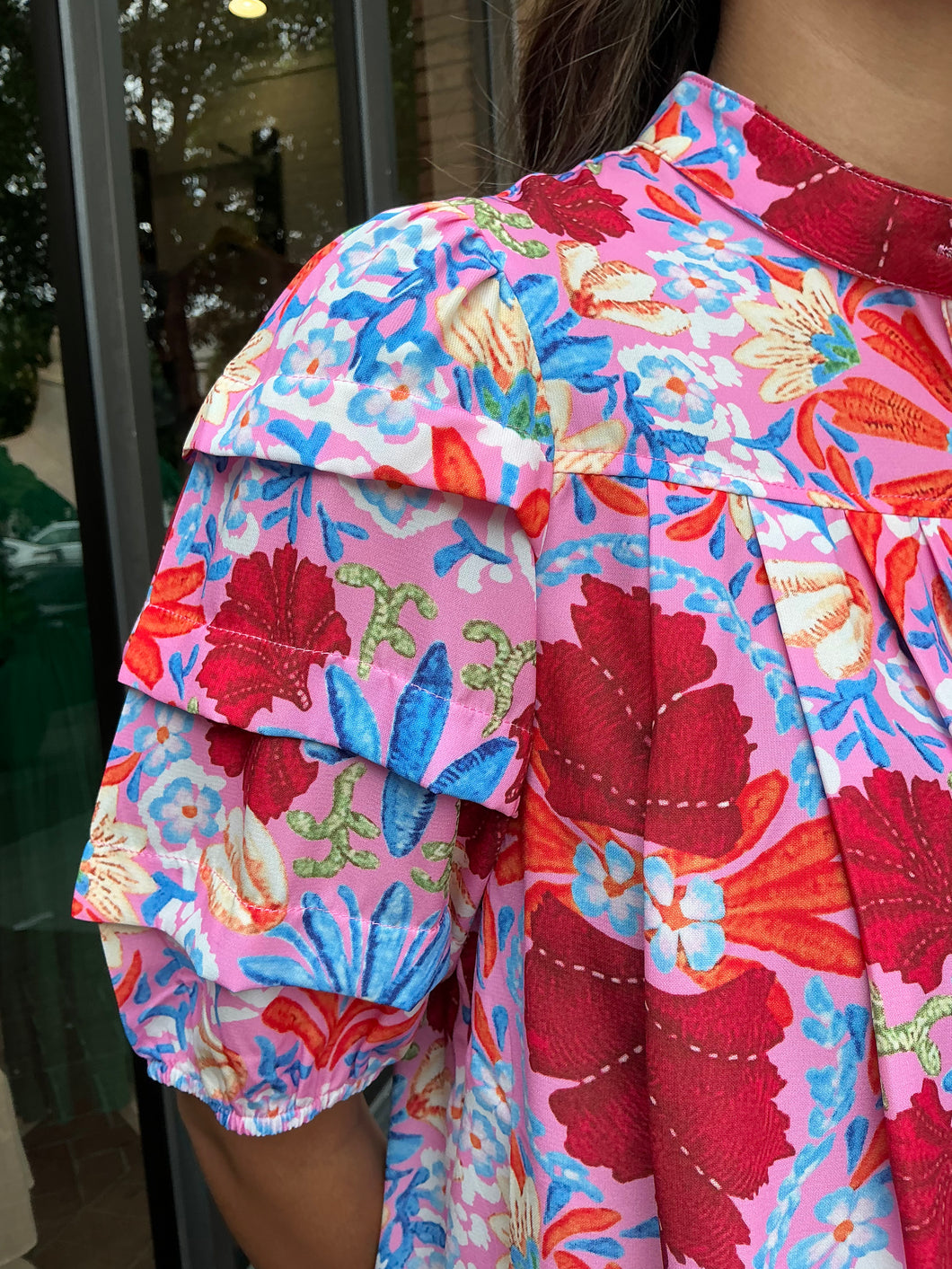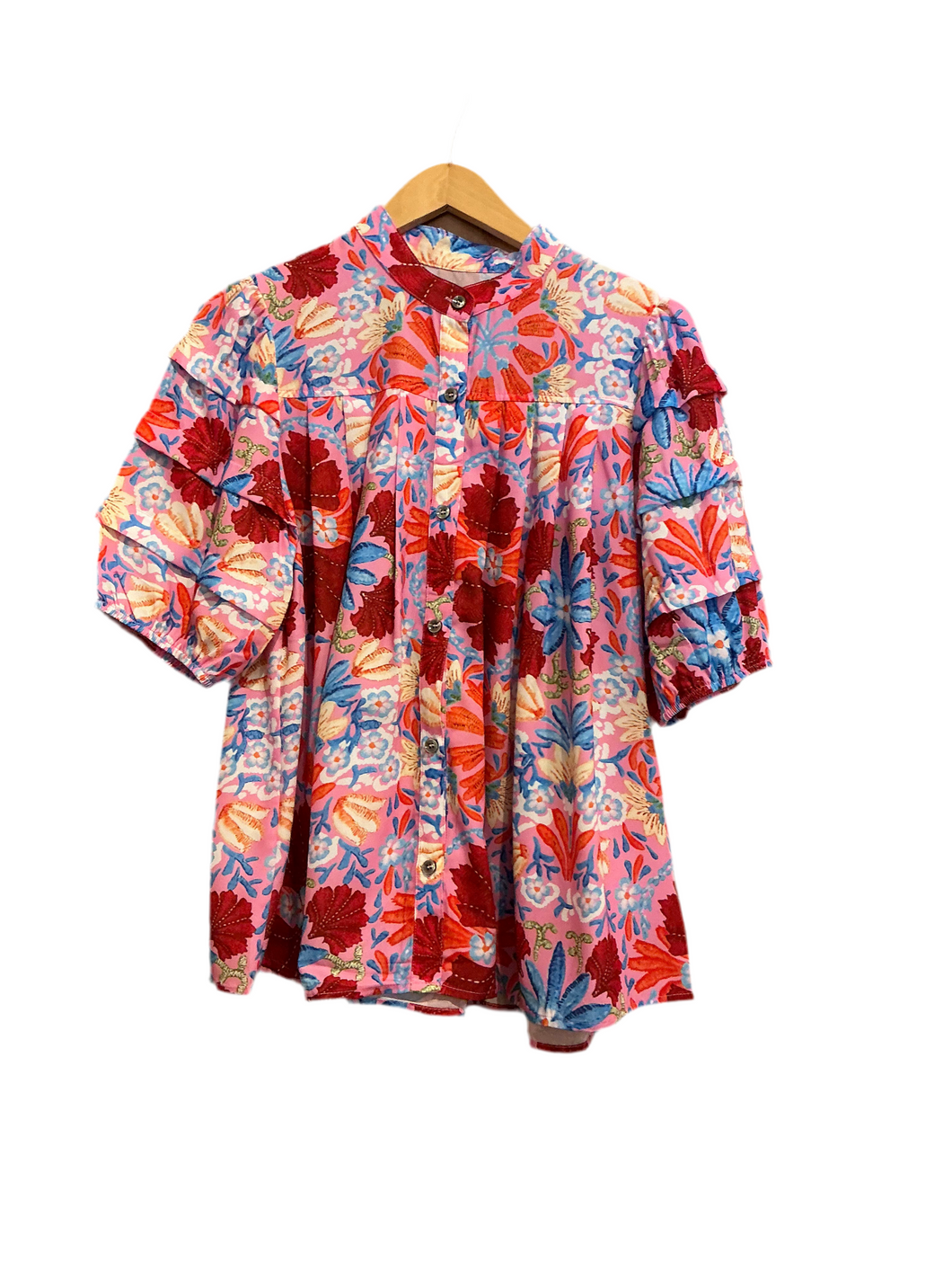 Pink Multi Color Floral Button Top with Ruffle Layered Sleeve