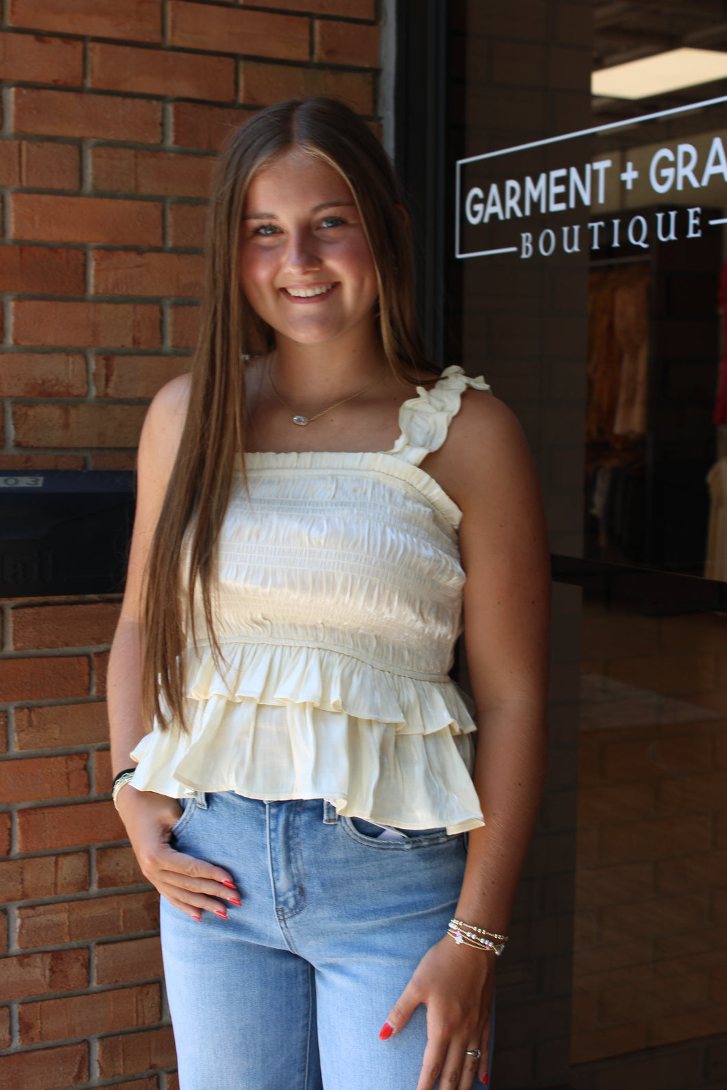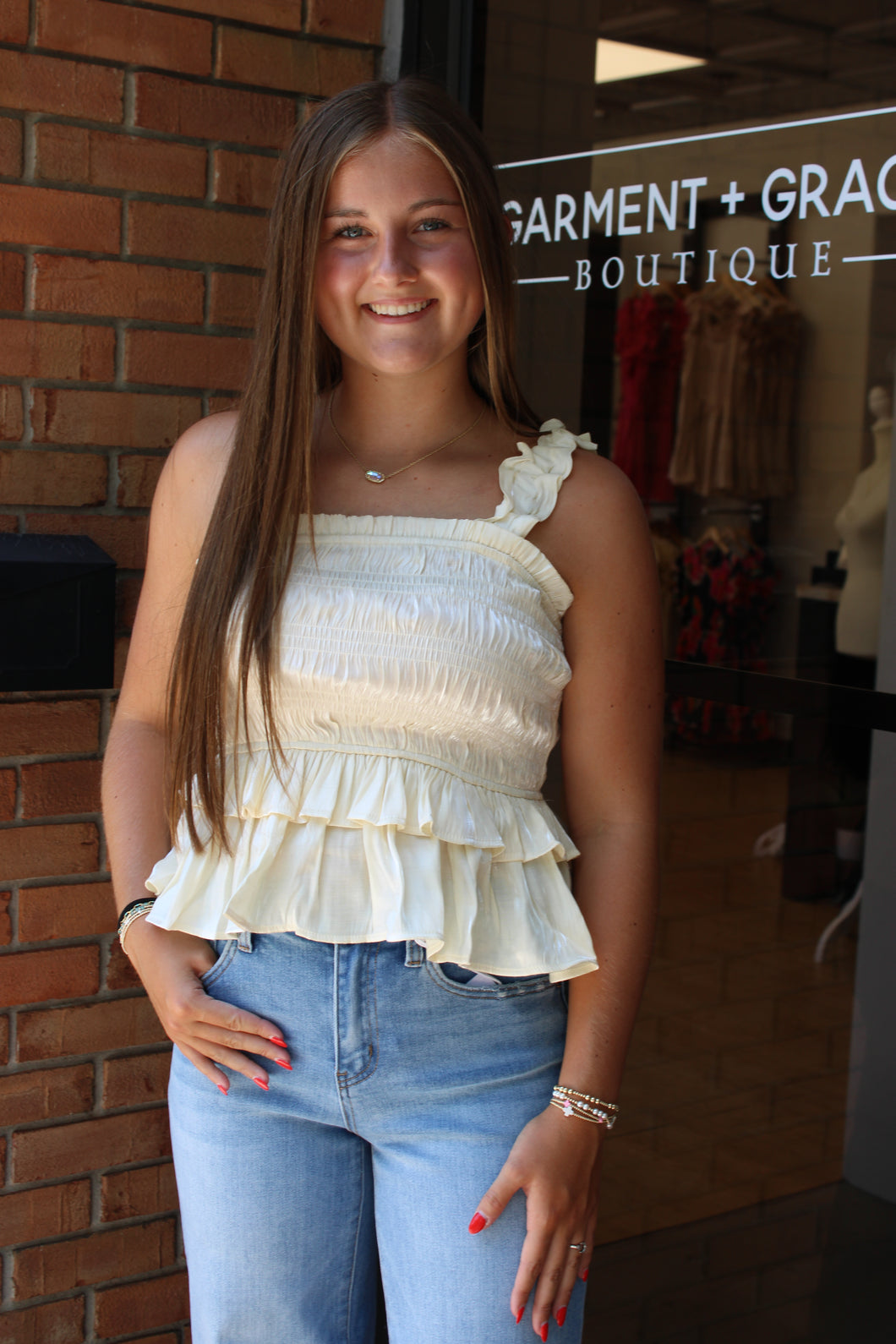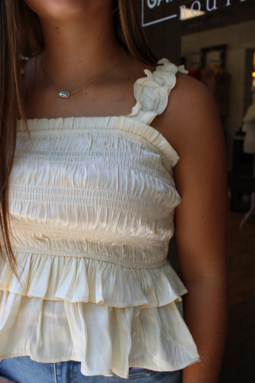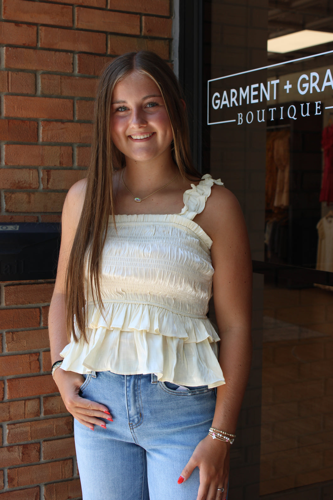 Ivory Satin Spaghetti Strap with Ruffle Bottom Top