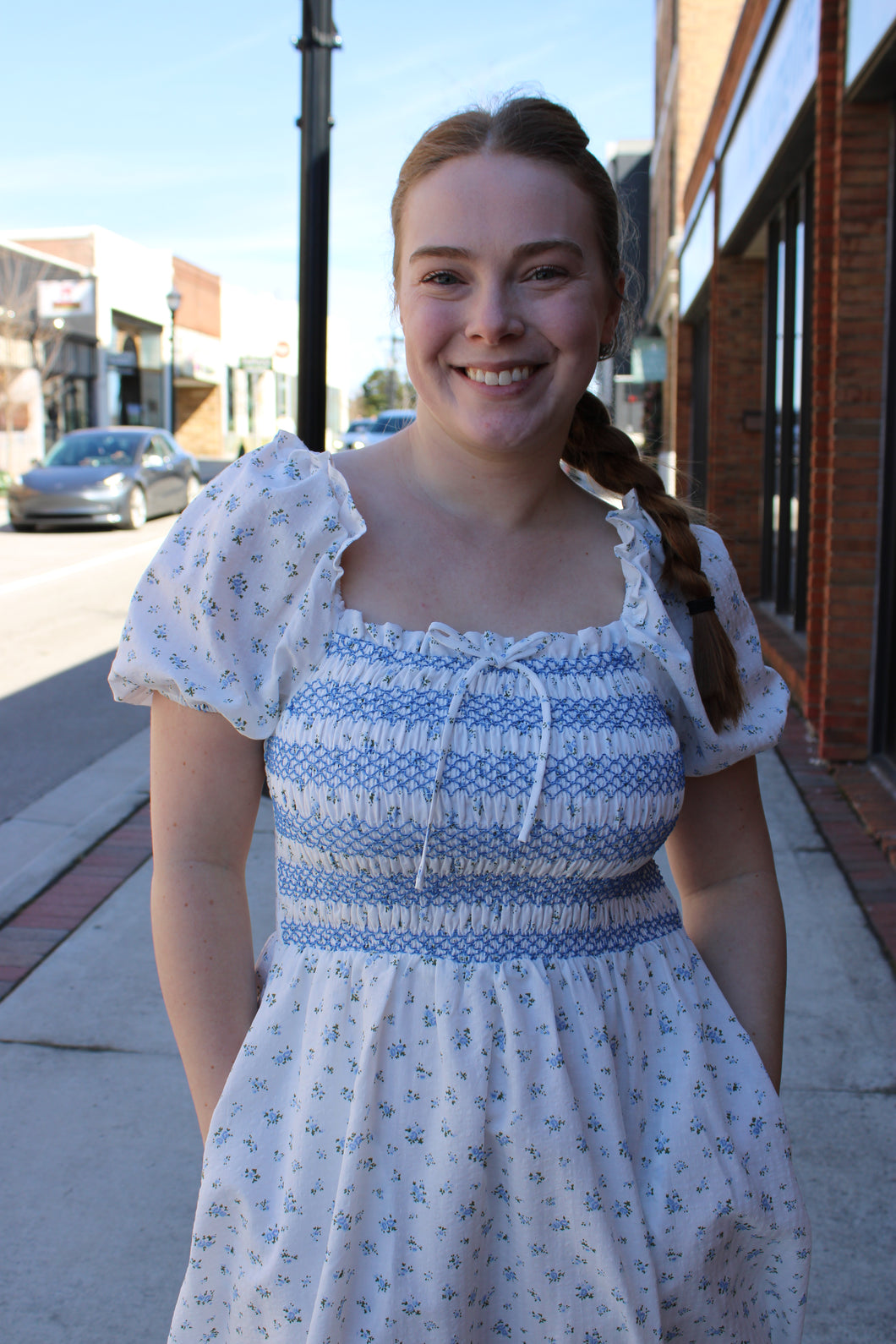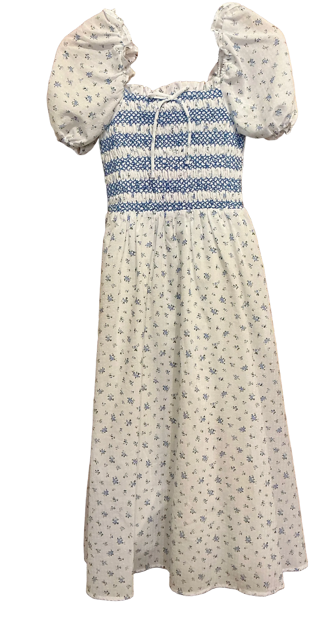 White with Blue Striped Smocked Top / Blue Floral Print Maxi Dress with Pockets