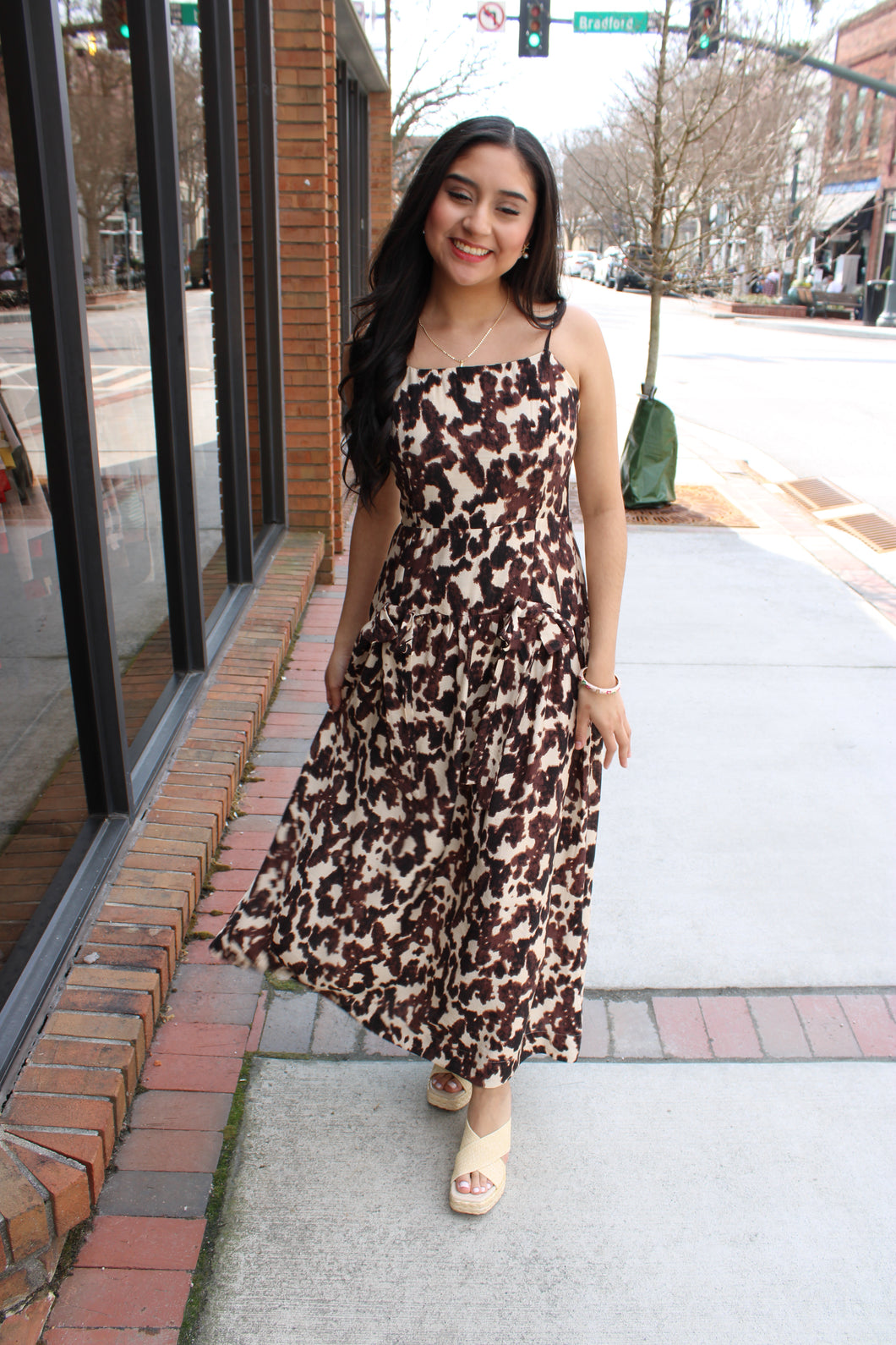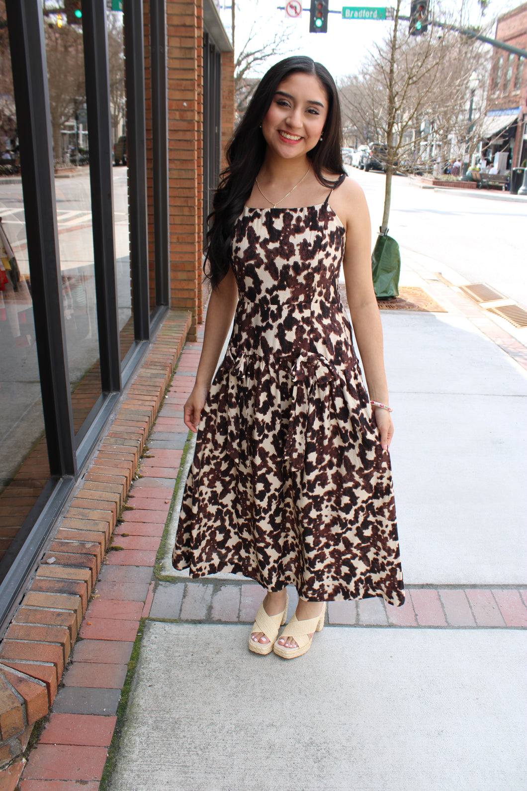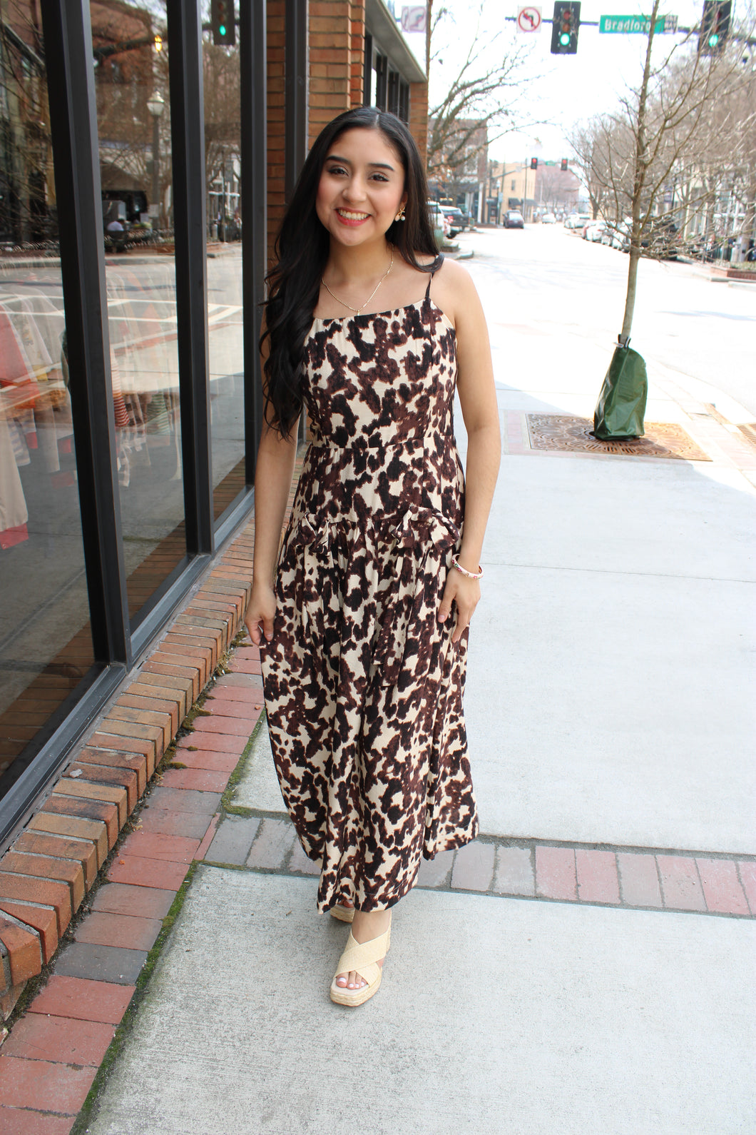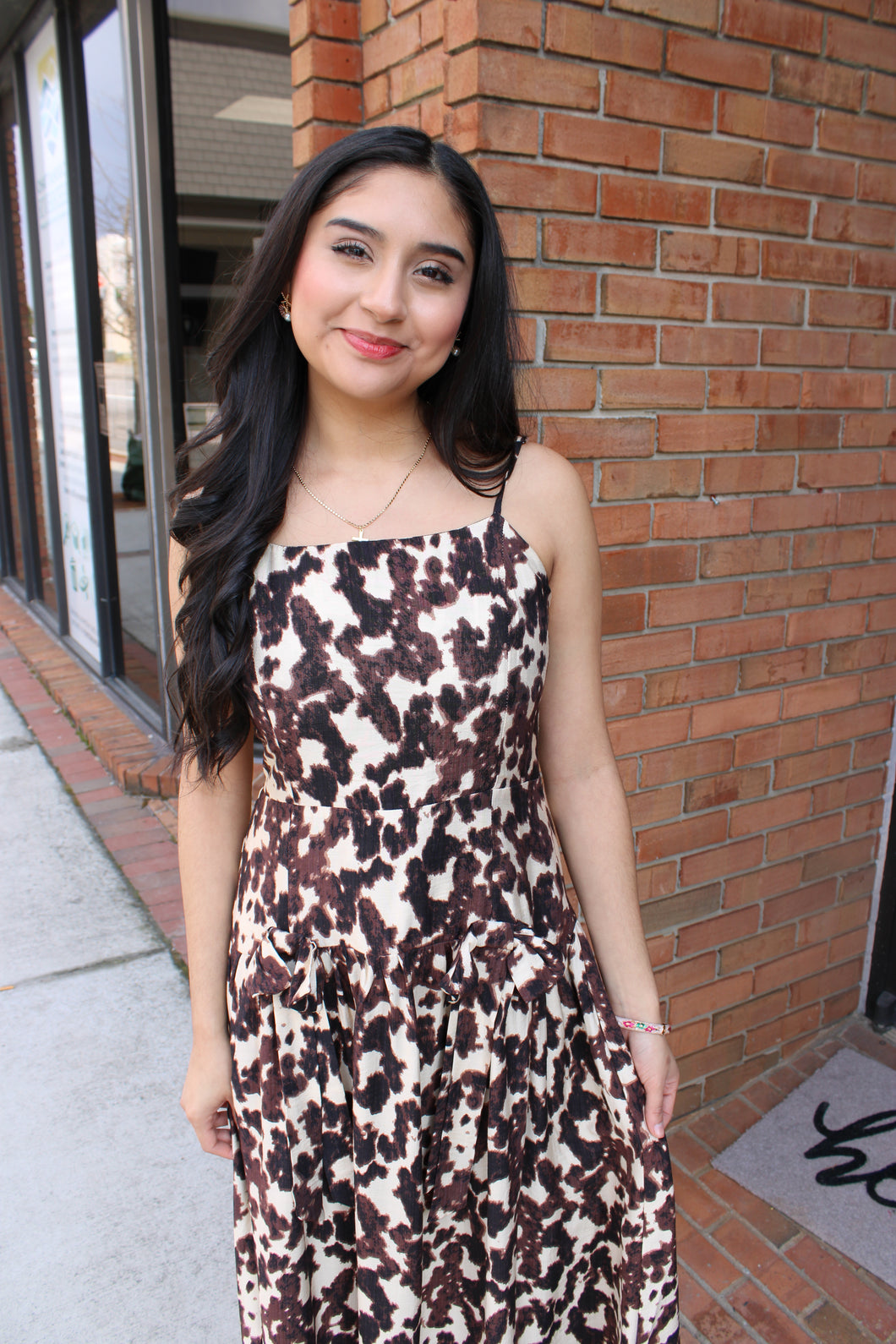 Cream and Brown Cow Print with Bow Front and Drop Waist Spaghetti Strap Dress