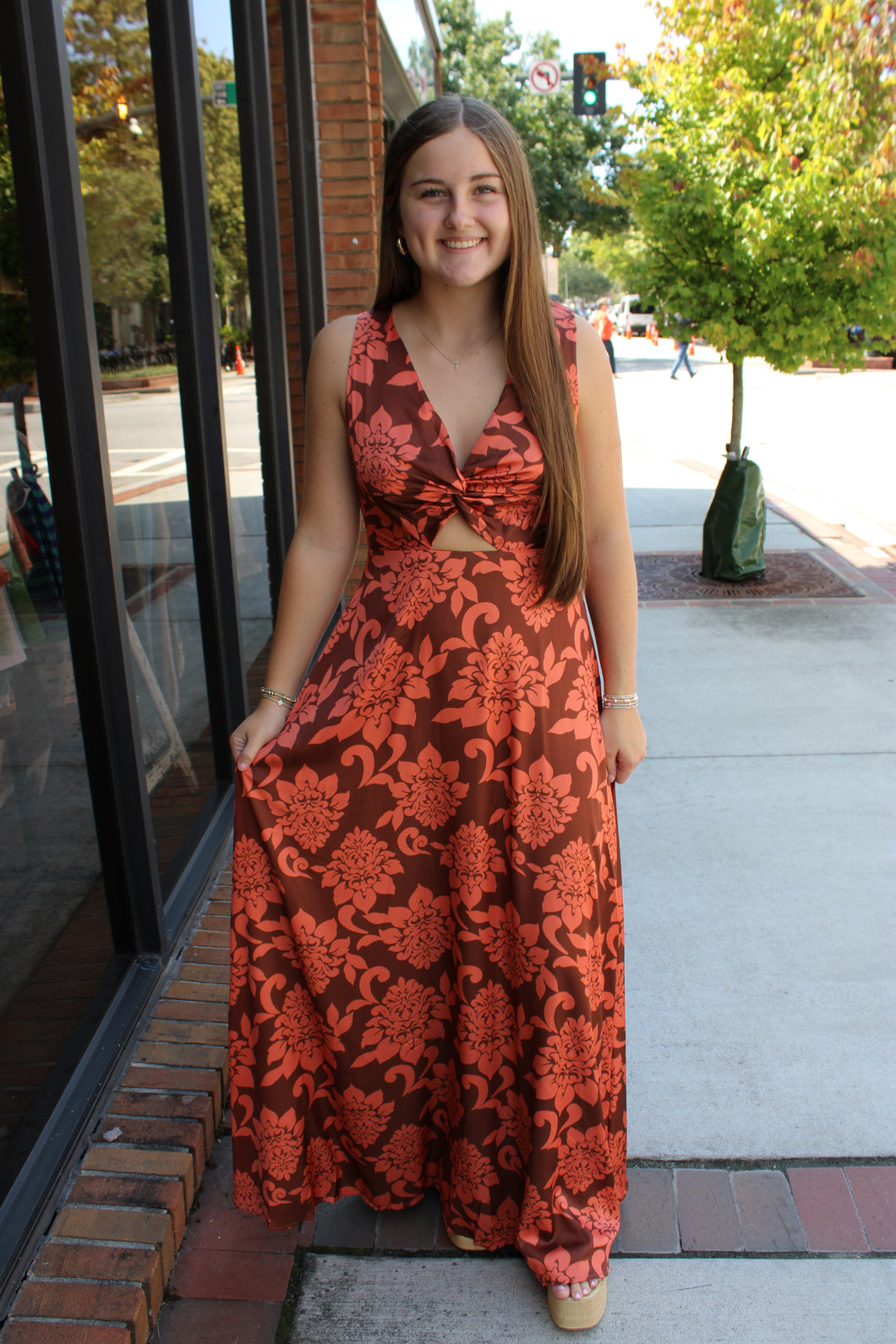 Orange and Brown Floral Silk V Neck Key Hole Maxi Dress