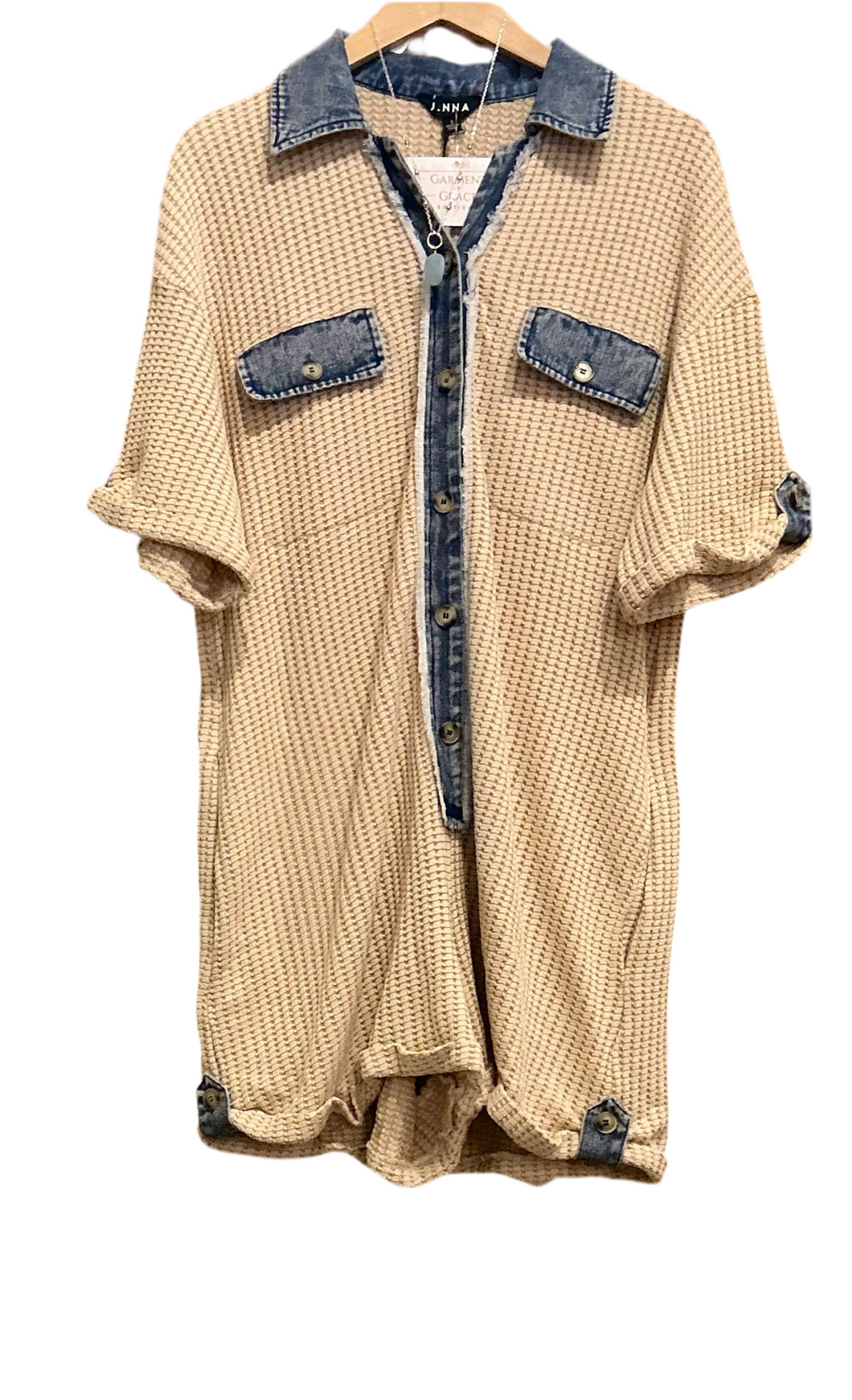 Khaki with Denim Button Sleeve andFront Pockets with Frayed Denim Button Front Waffle Romper