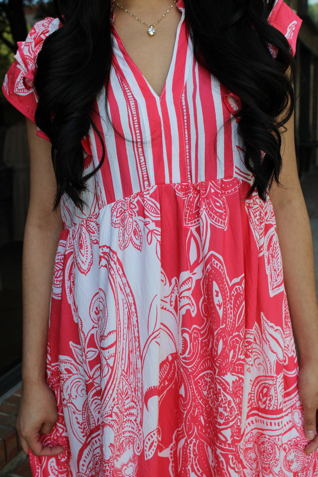 Red Orange Abstract Pattern Design Dress With Flutter Sleeves