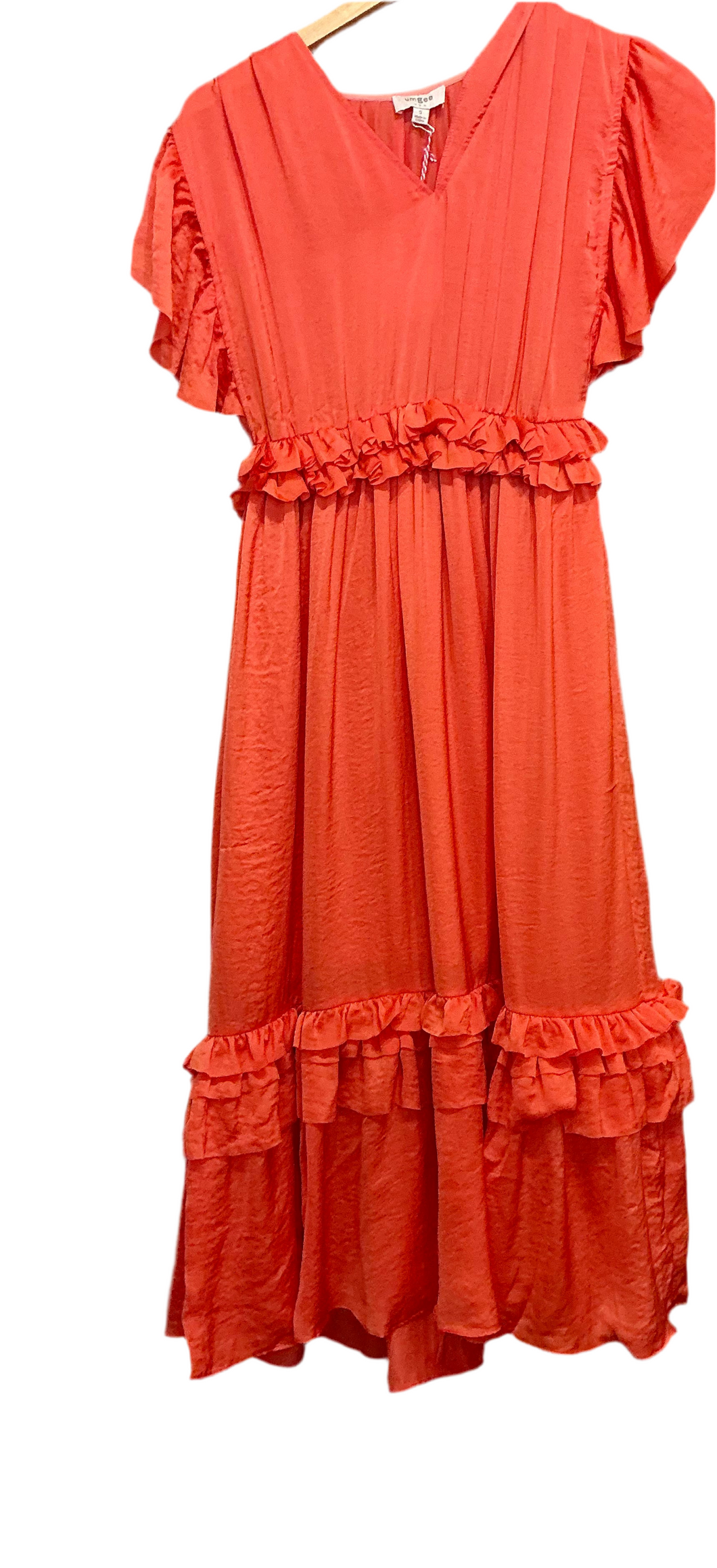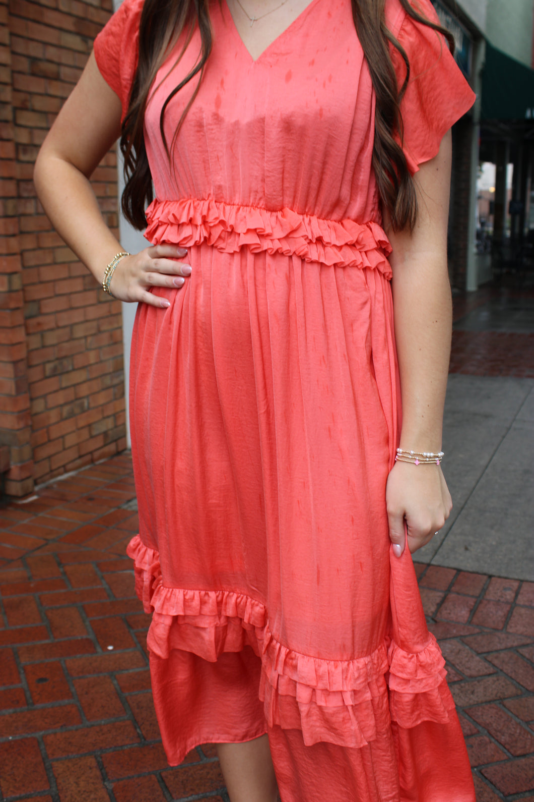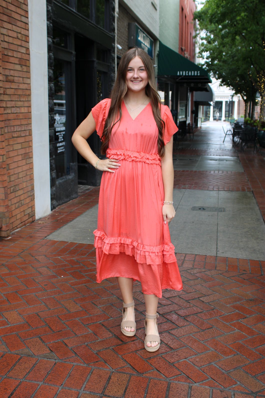 Coral Ruffle Waist Flutter Sleeve Midi Dress