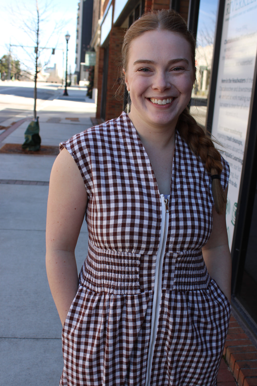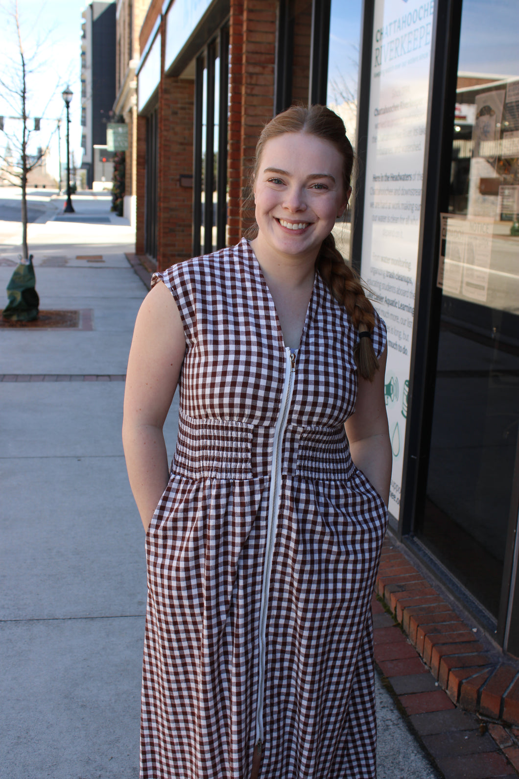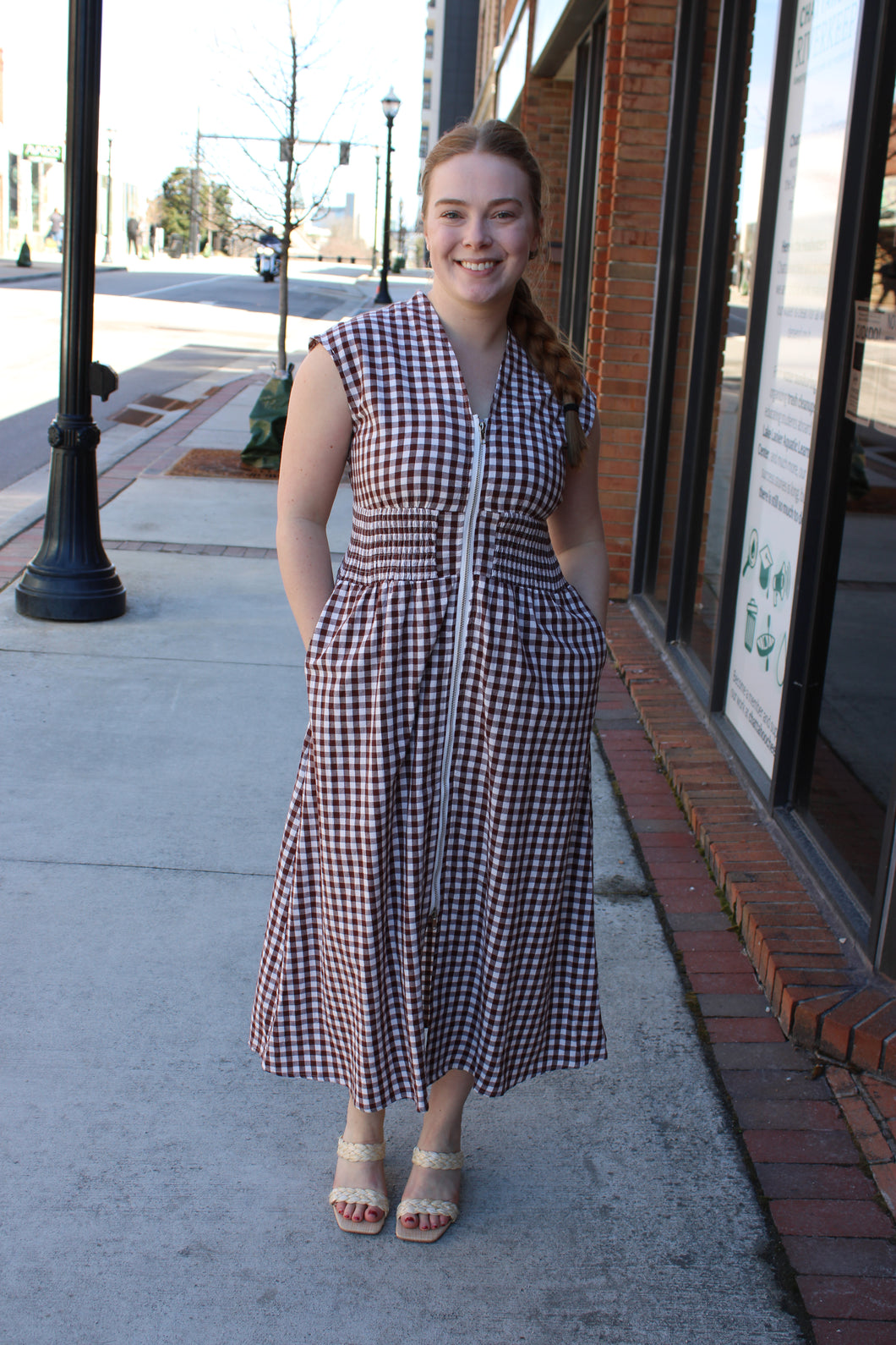 Gingham Brown Sleeveless Dress With Scrunched Waist And Zipper
