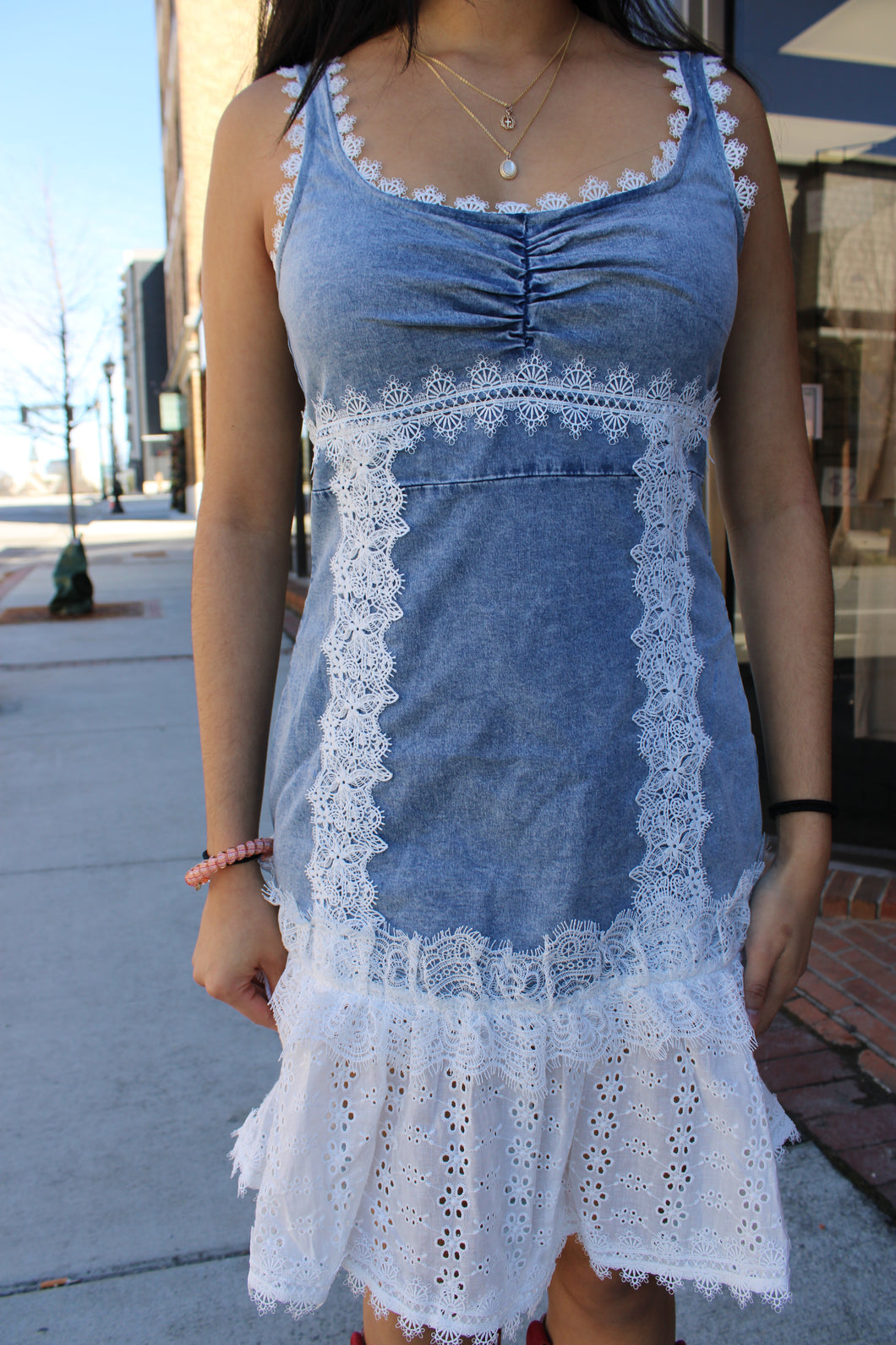 Denim Tank Dress with White Lace And Islet Lace Bottom