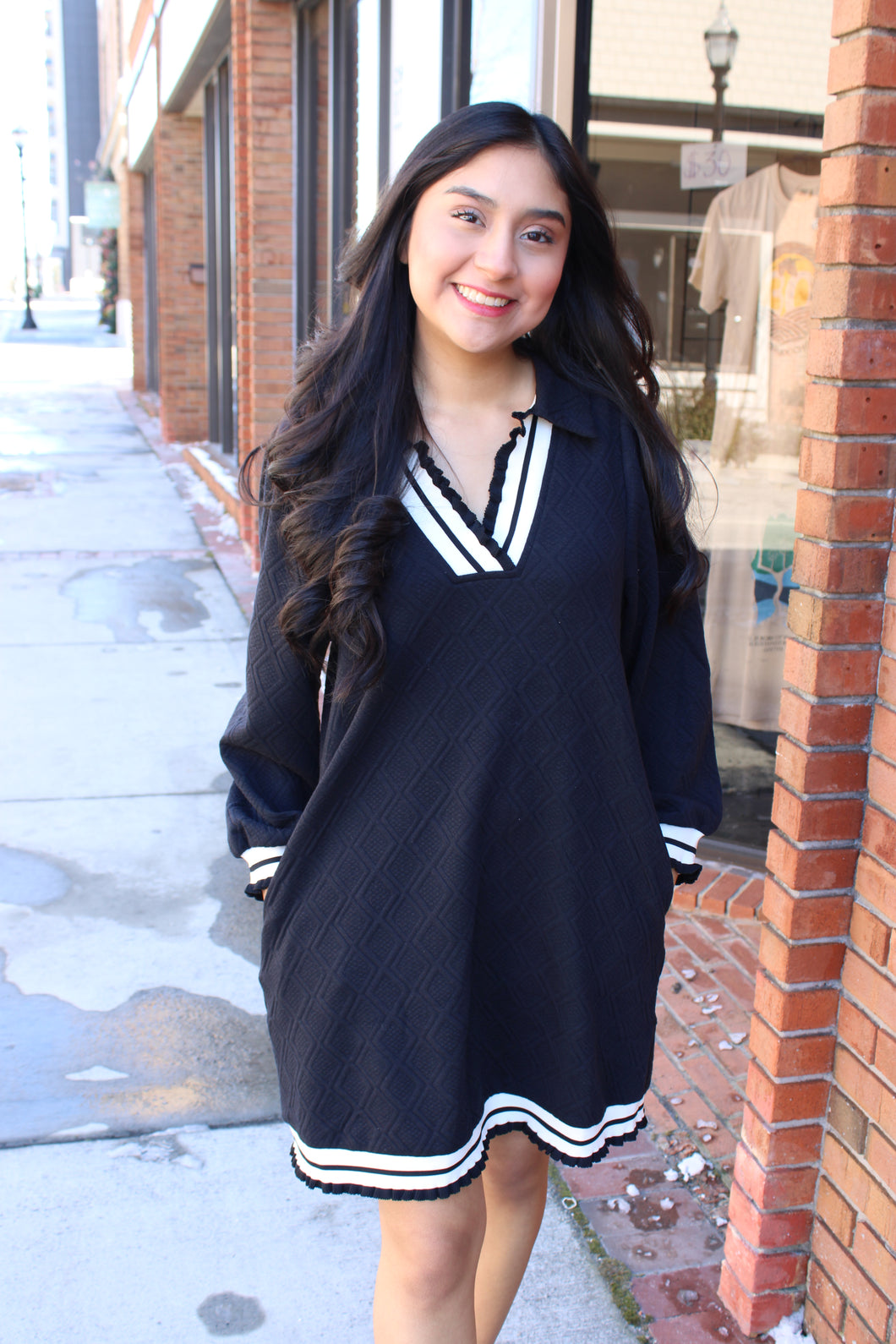 Black with White. Stripe V-neck Top and Hem Shift Dress