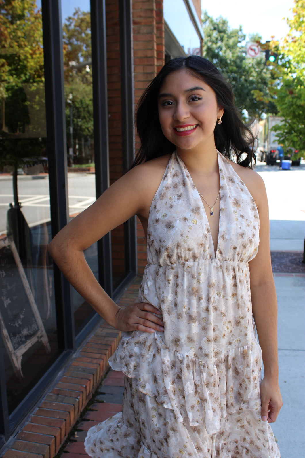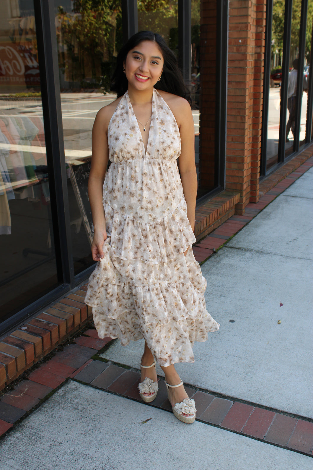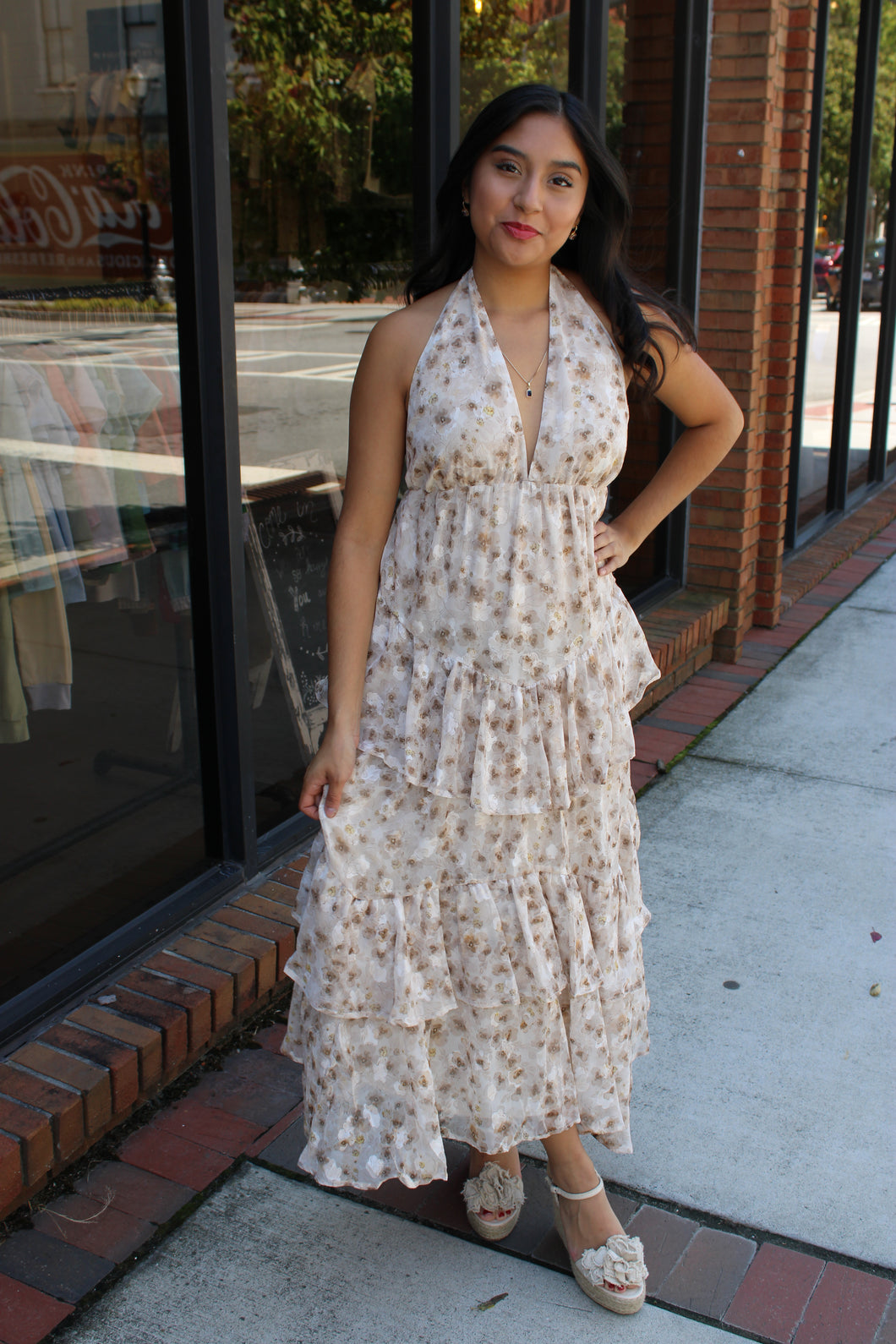 Tan and Cream Floral Hater Neck Ruffle Maxi Dress