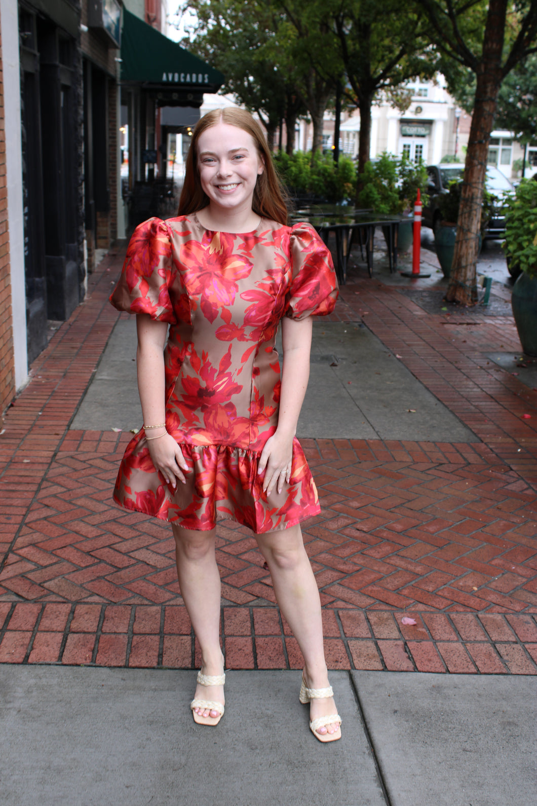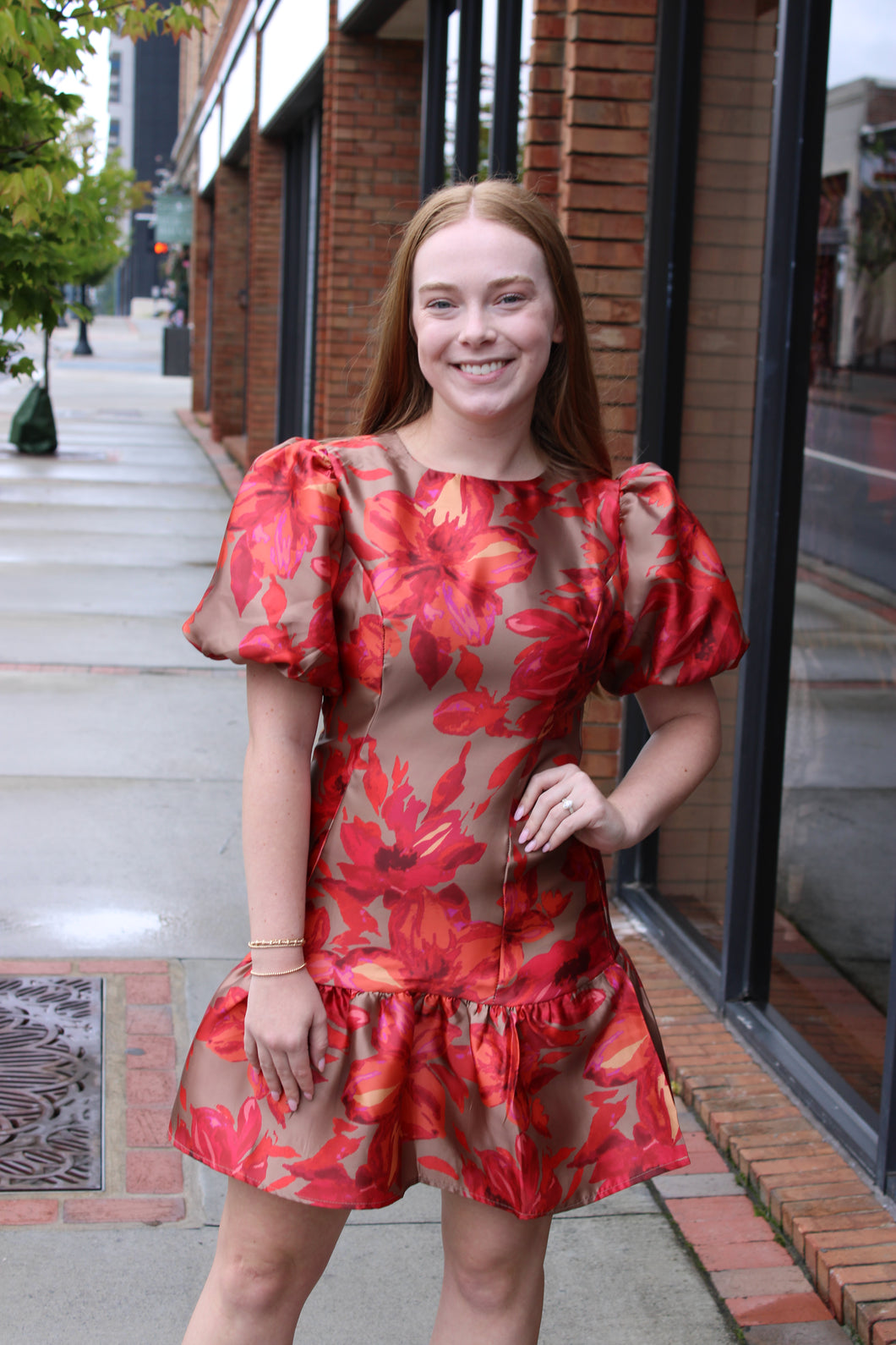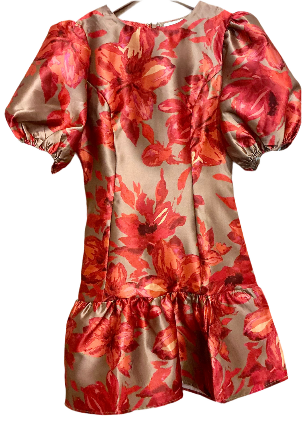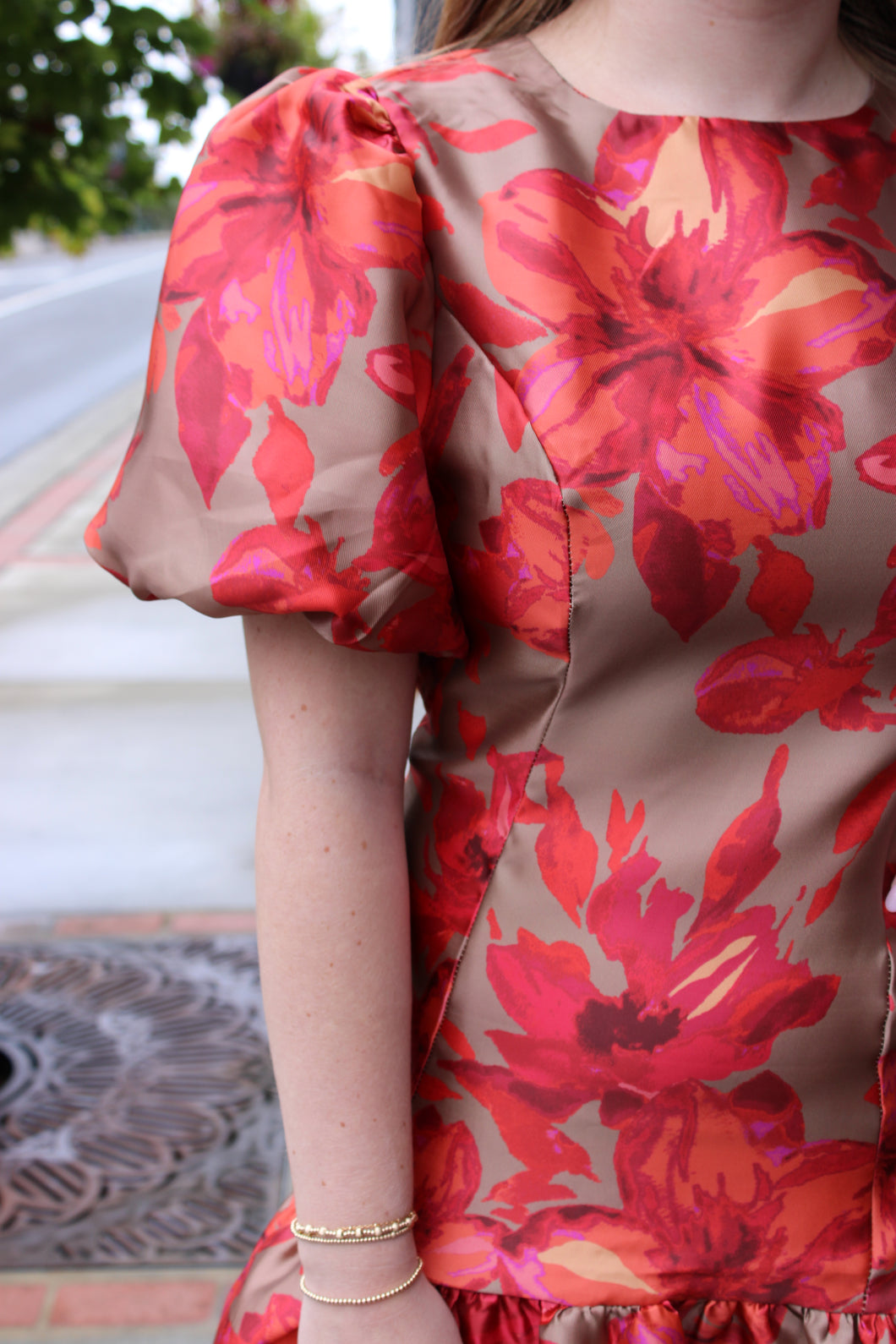 Brown Puff Sleeve With Orange Floral Print Mini Dress