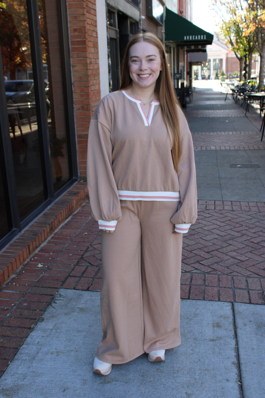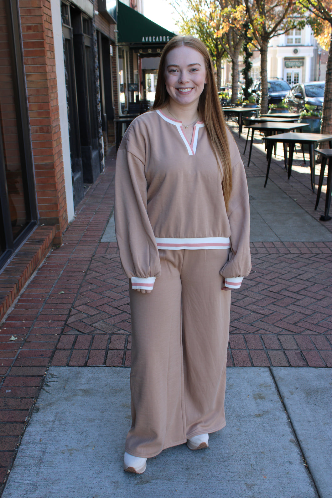 Mocha Long Sleeve Two Piece Sweatshirt Set with Salmon Striped Cuff and Neckline