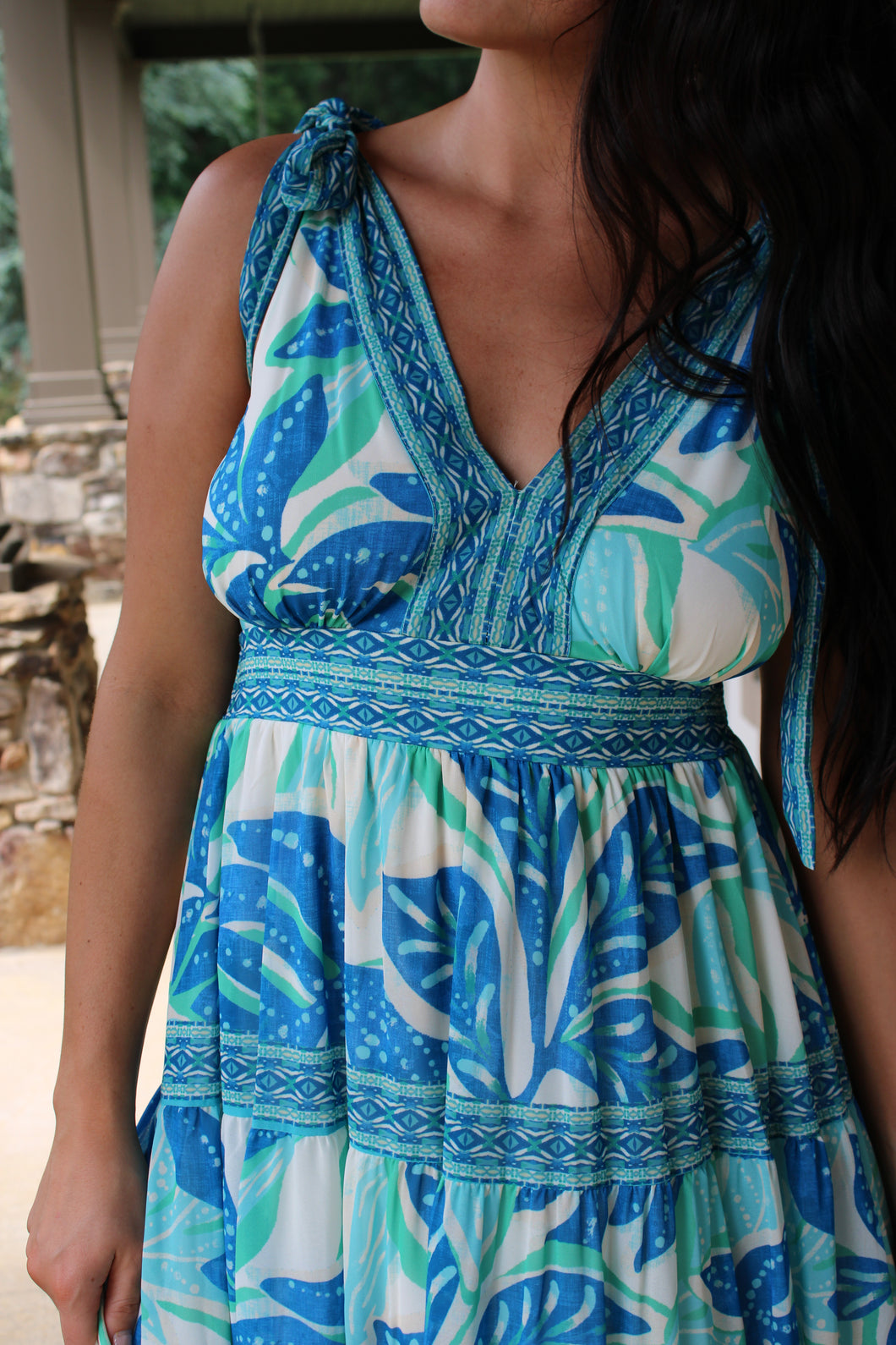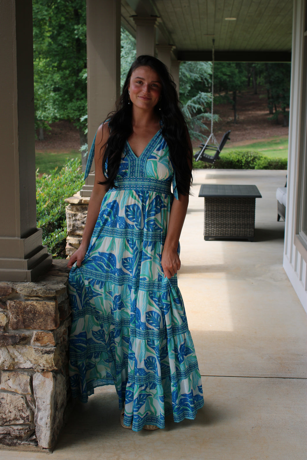 Woven Maxi dress feat V neckline, shoulder tie, smocked waistband and tiered skirt.