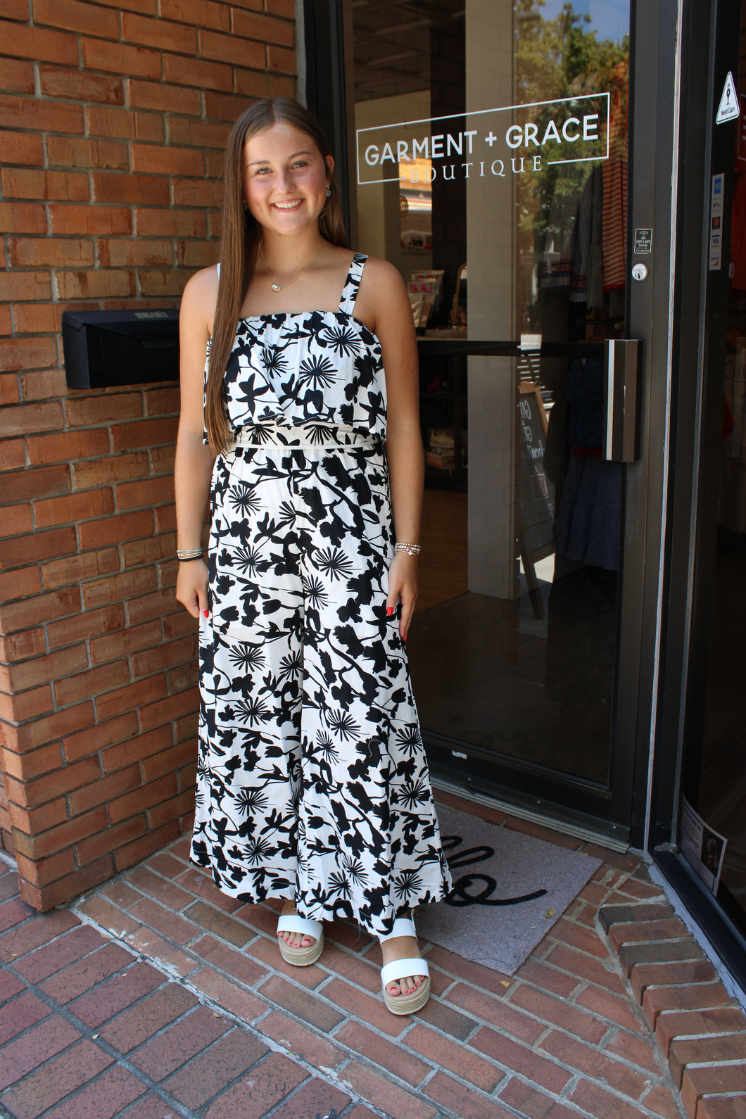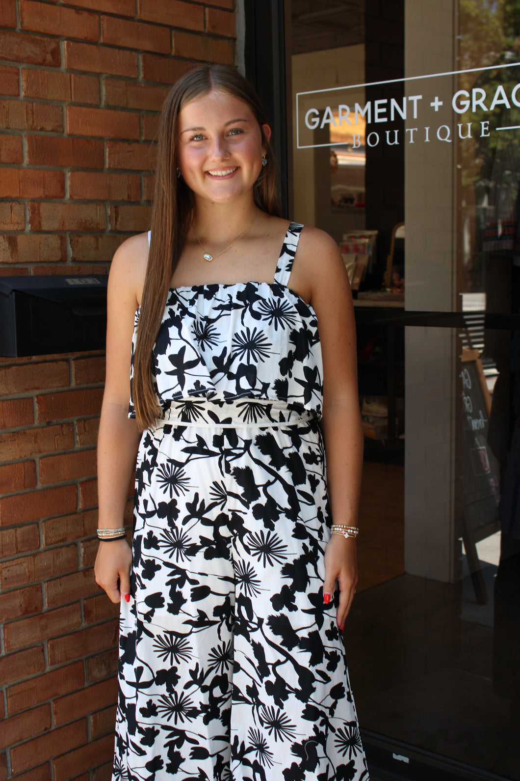 Black and White Floral Design Spaghetti Strap Lined Jumpsuit