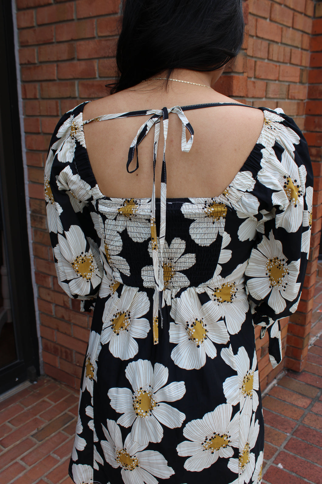 Black With Yellow and Cream Poppy Flower Tie Back  Dress
