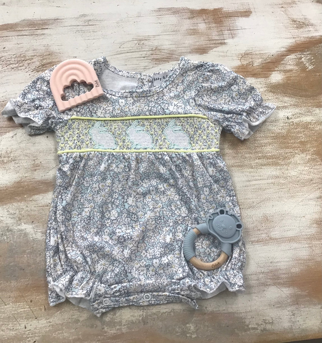 Floral Bunny Bubble/Dress50% Cotton 50% SpandexWhite Flower Pattern with Yellow Stitching Across and Teal Bunny Stitching Outline Bubble/Dress