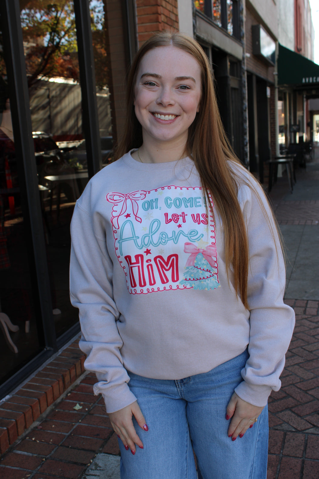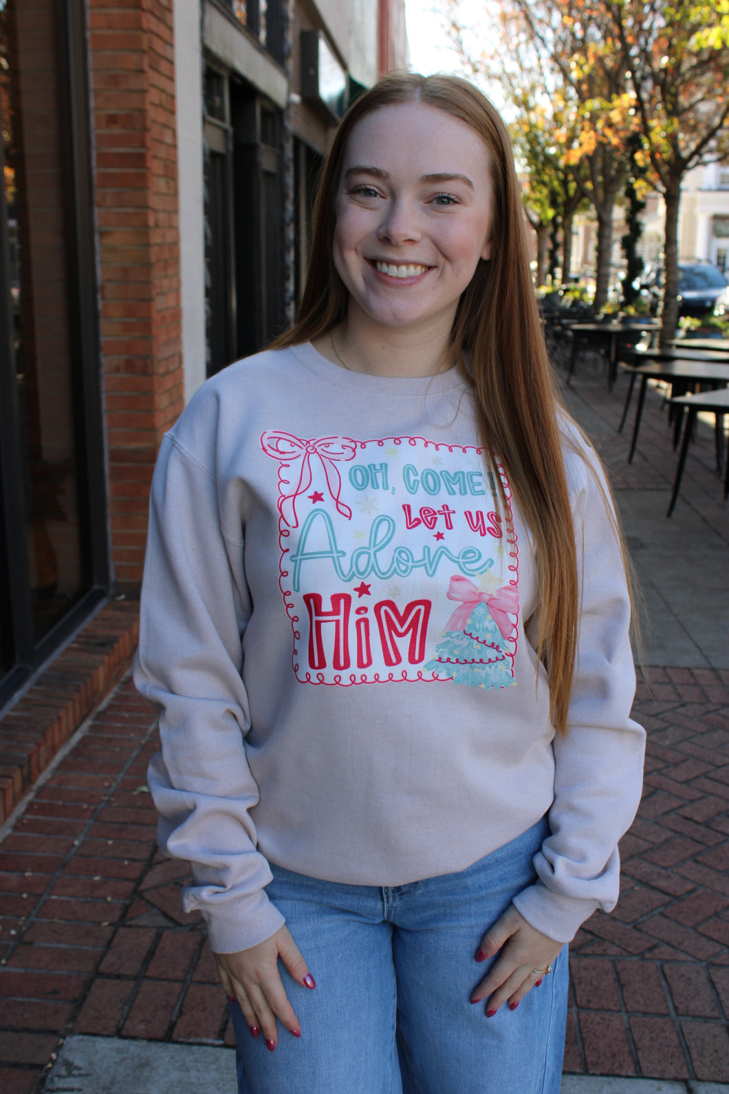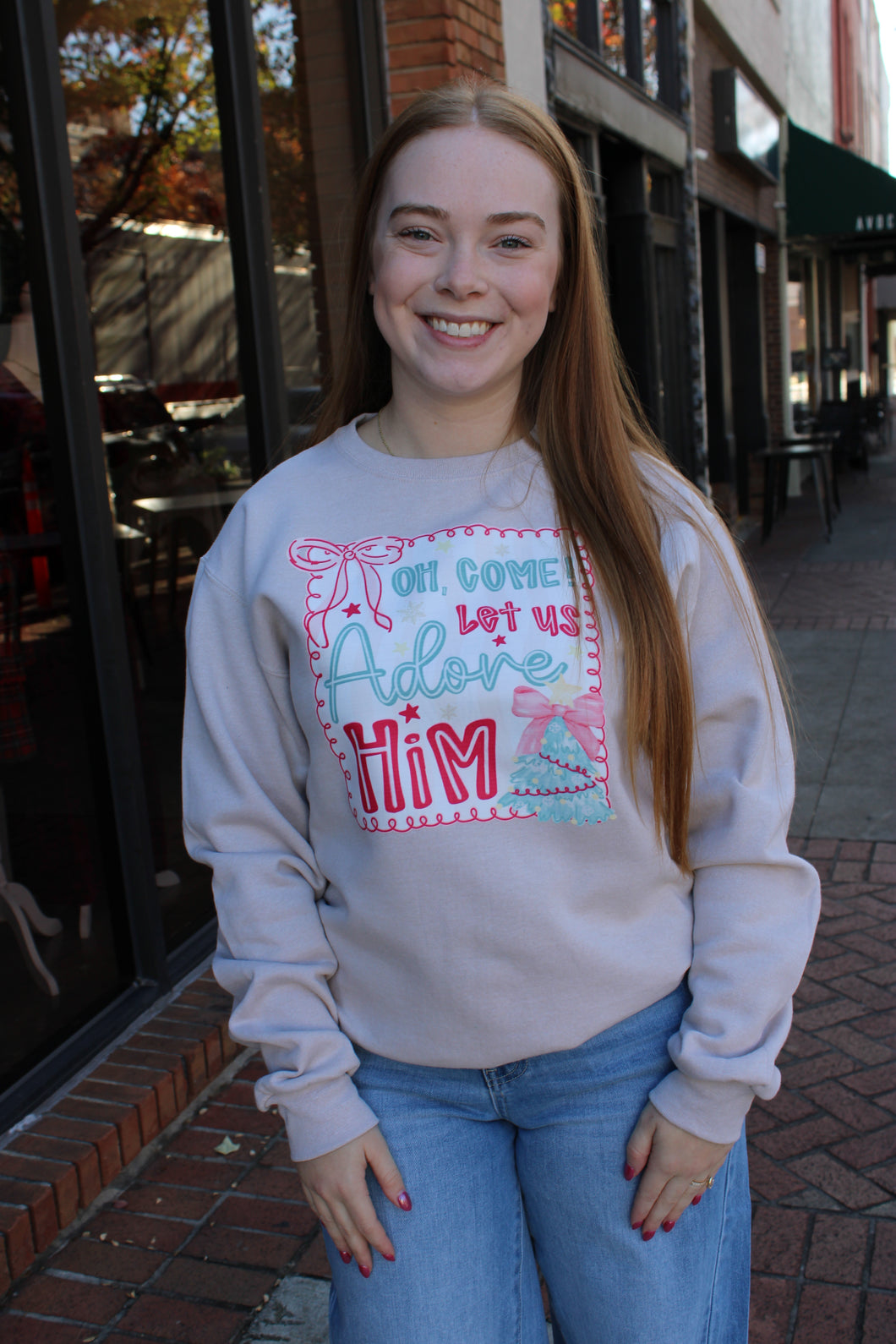 Beige Long Sleeve Sweatshirt with Oh Come Let Us Adore Him Screen Print