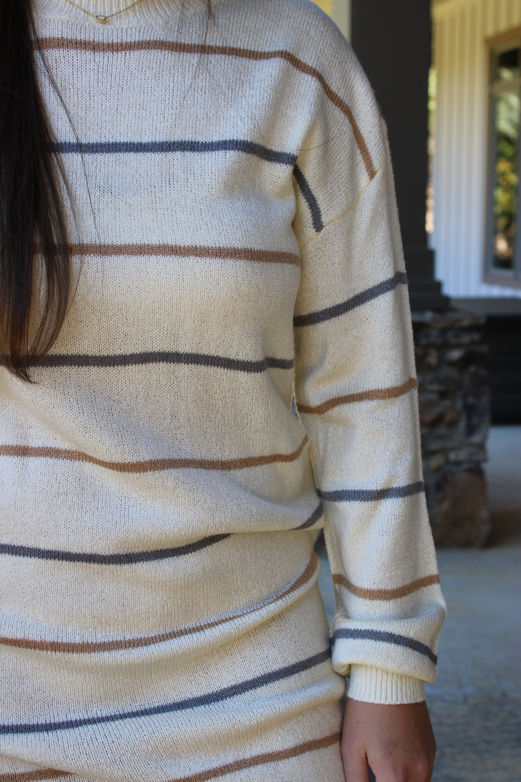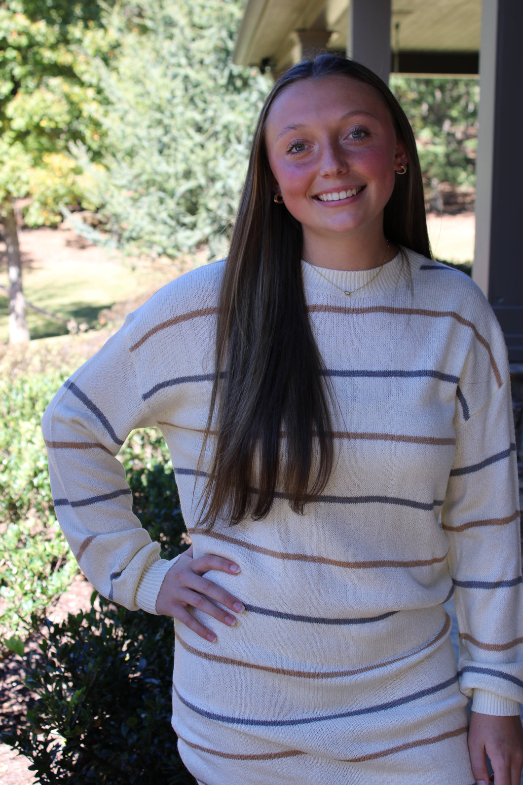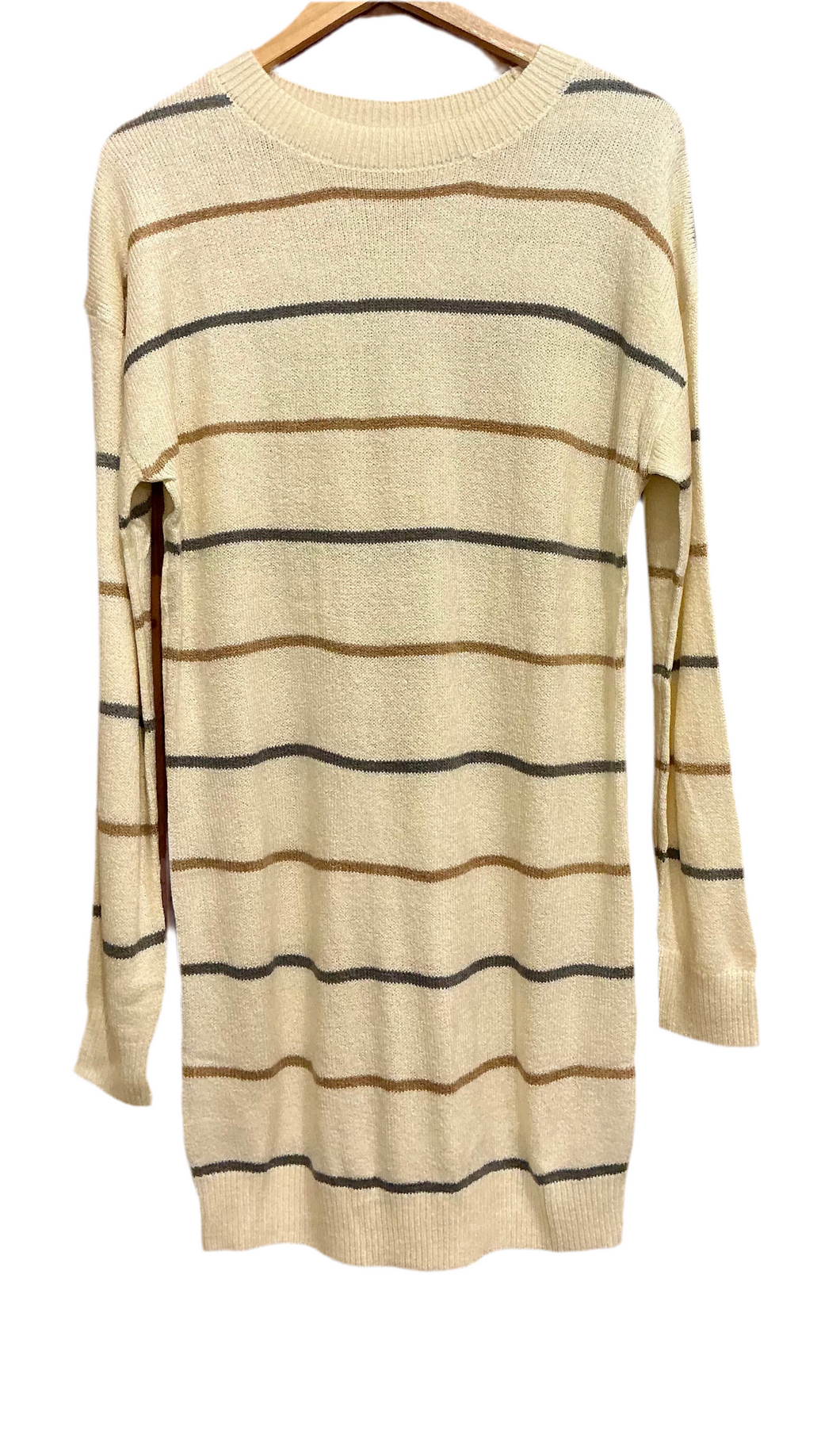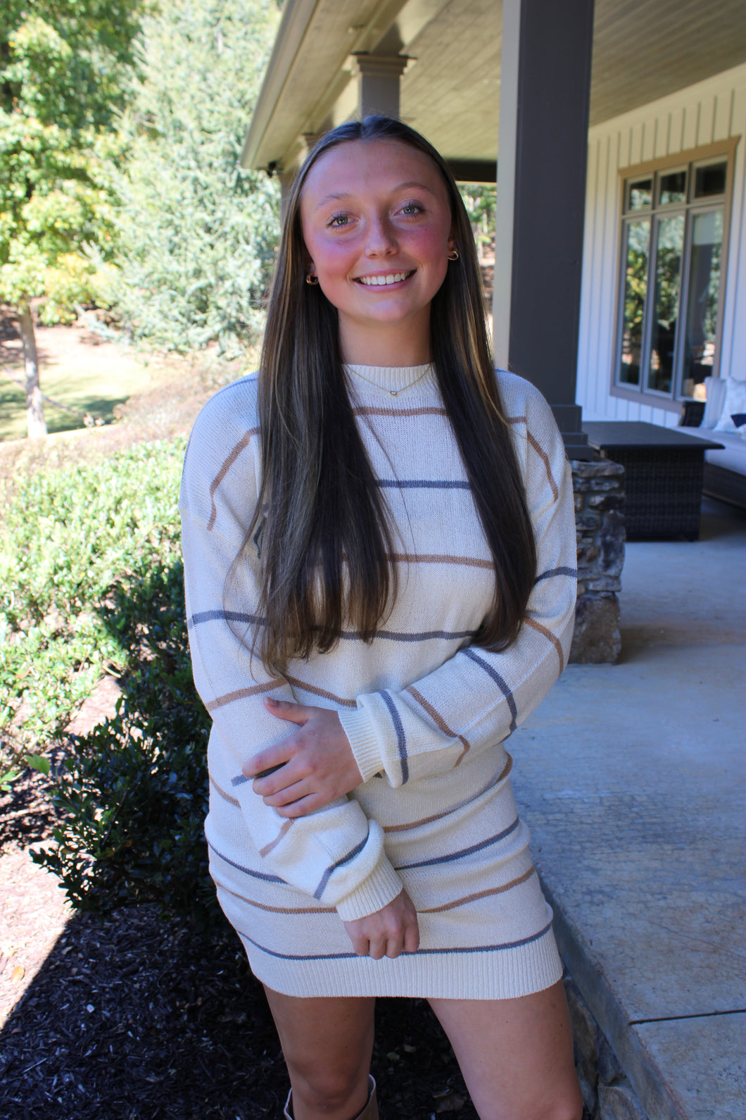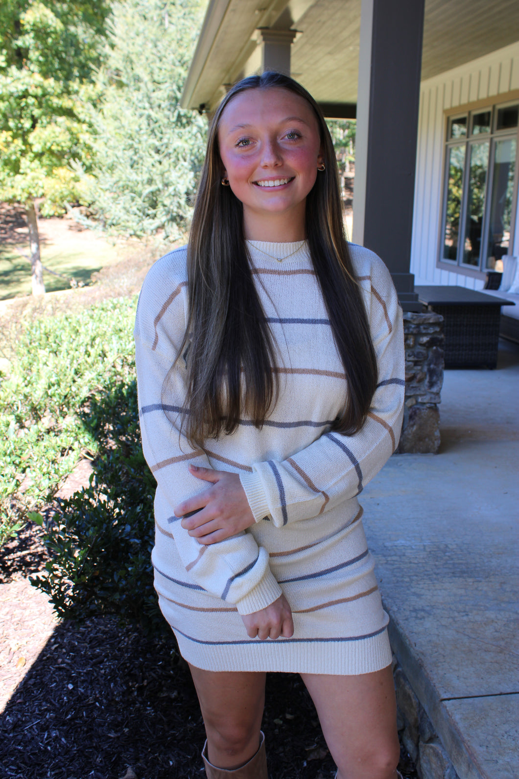 Cream Long Sleeve with Grey and Tan Stripe Sweater Dress