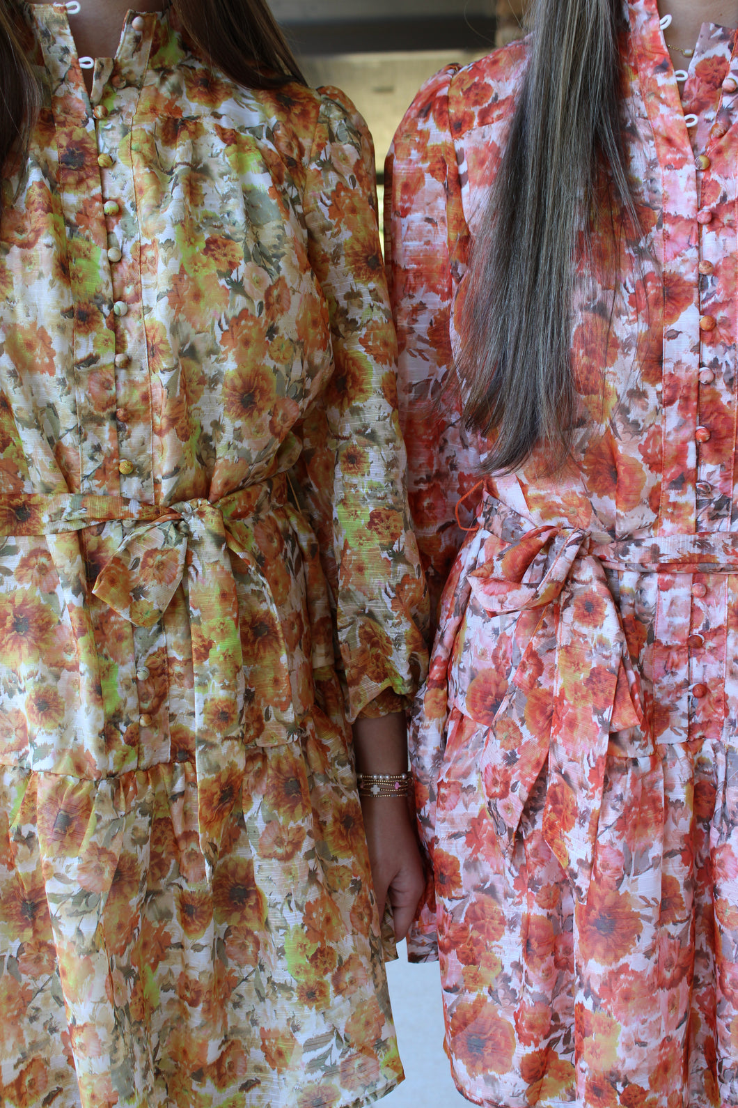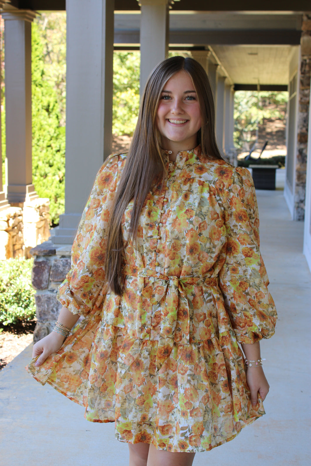 Light Orange or Dark Orange Floral Print ,Button Front Long Sleeve Tie Belt Mini Dress