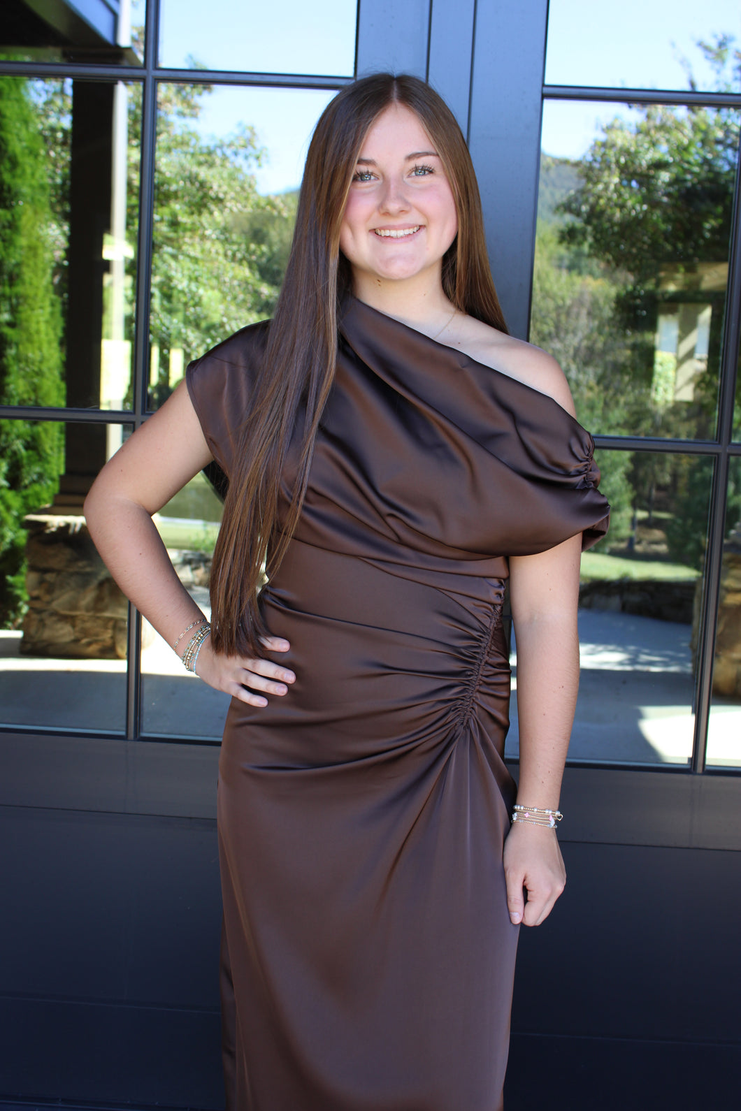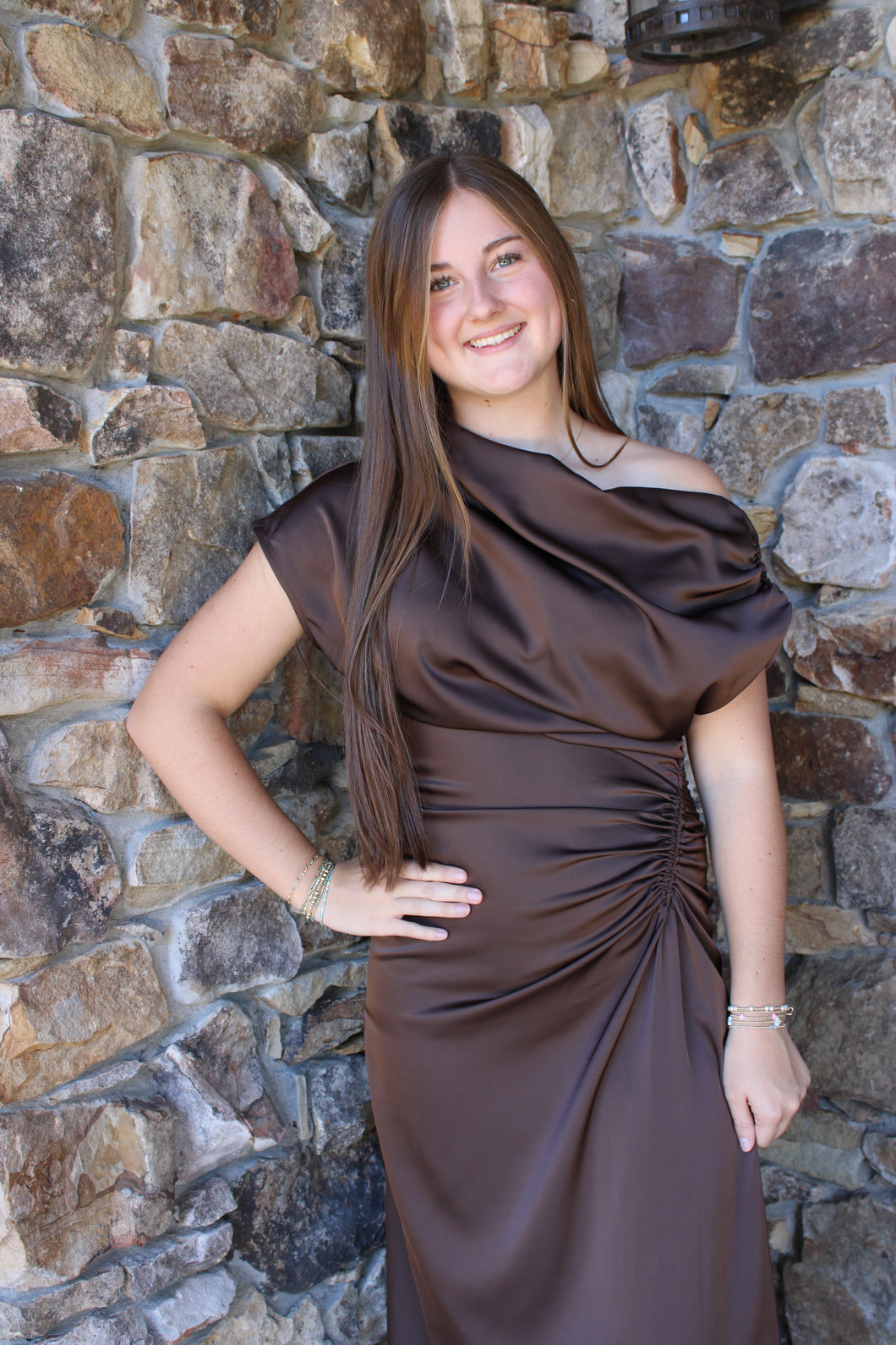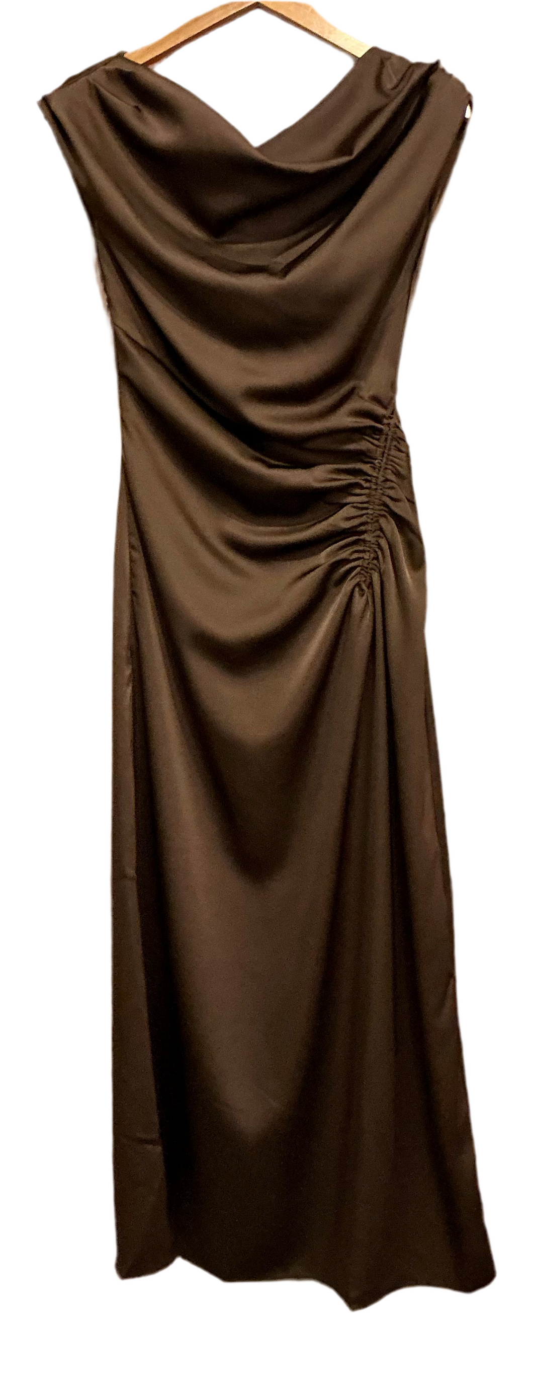 Chocolate Satin One Shoulder Ruched Front Maxi Dress
