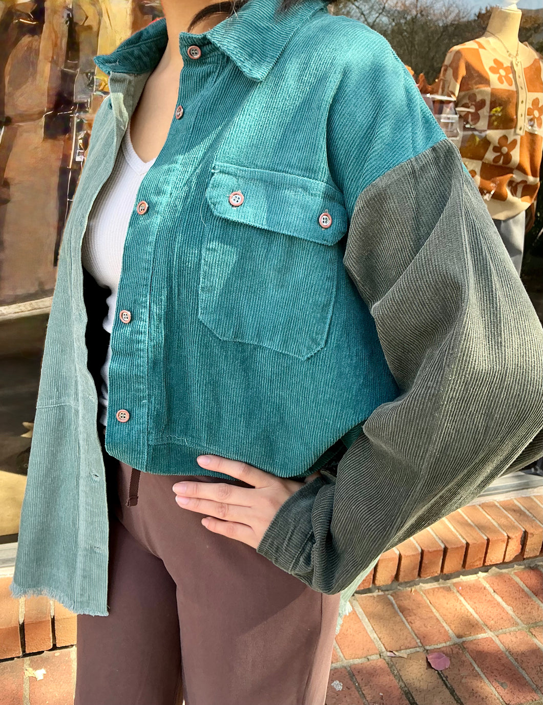 Jade and Light Blue Snap Front With One Grey Sleeve Corduroy Frayed Hem Jacket