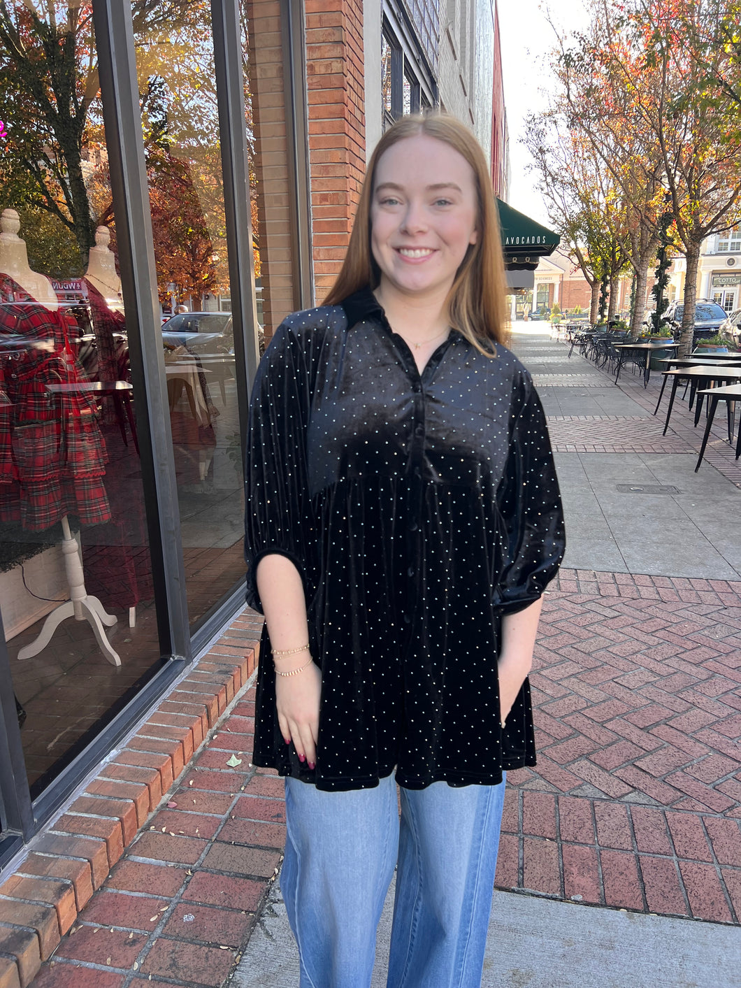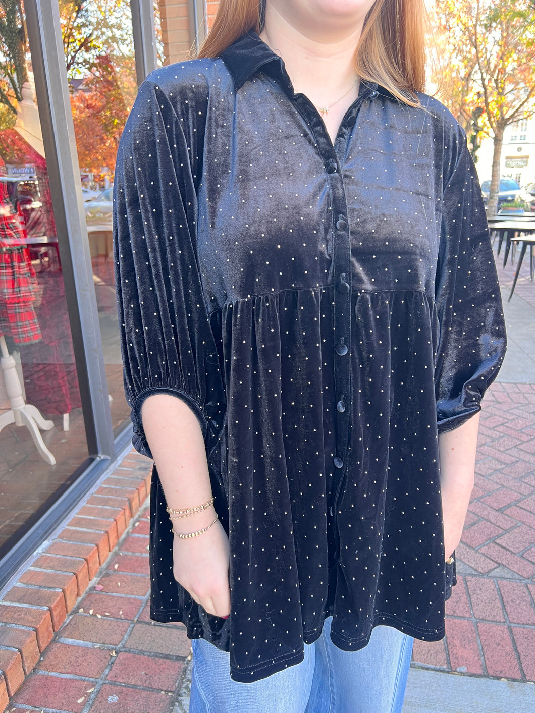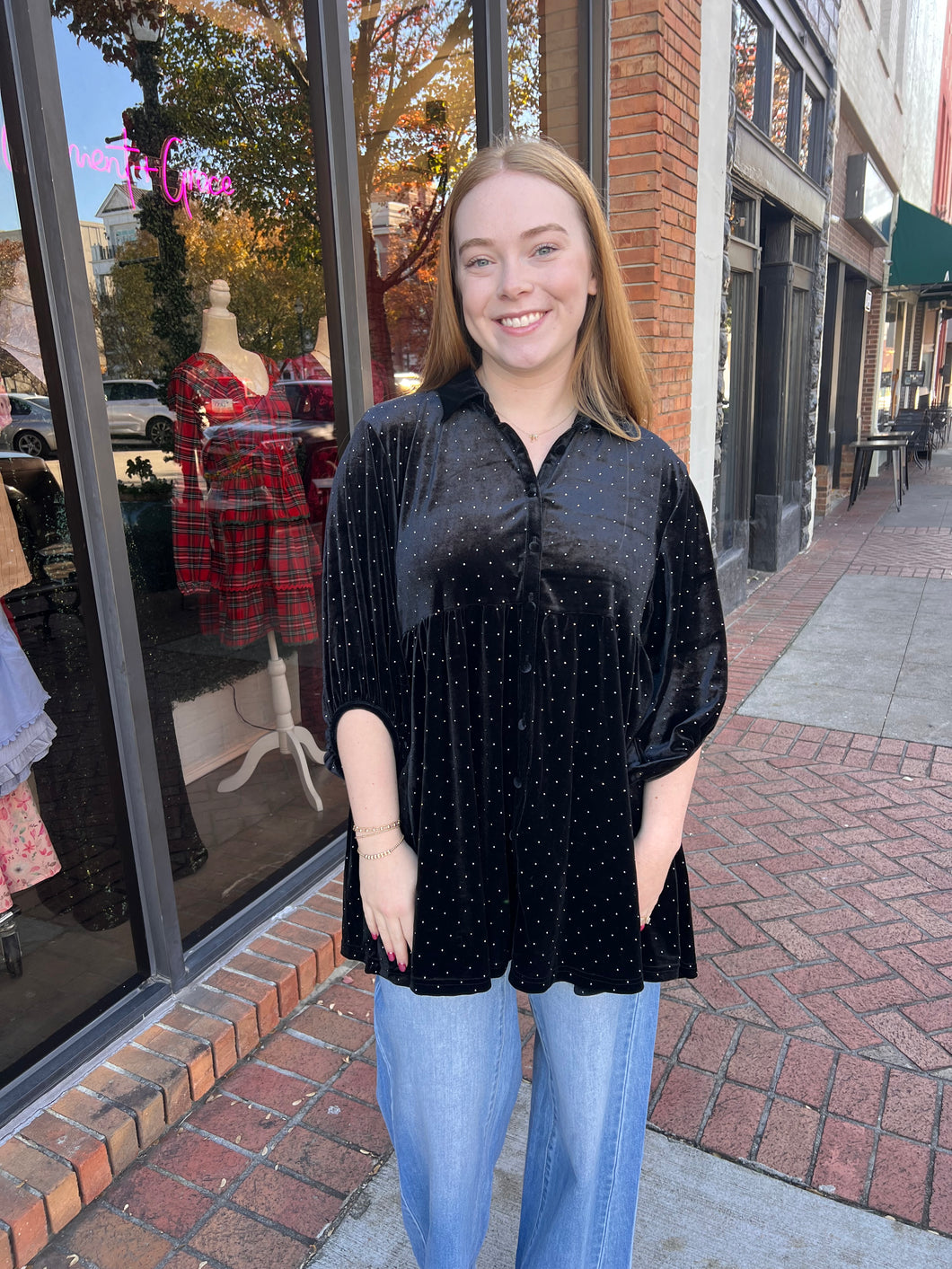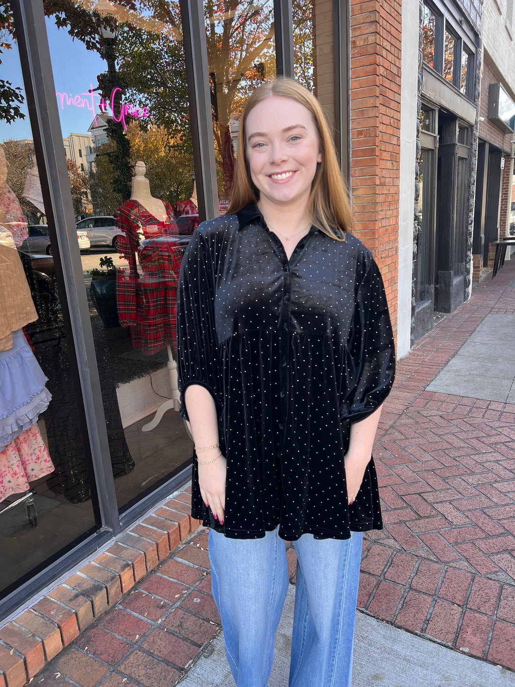 Black Velvet Button Tunic Top with Diamond Accents Quarter Sleeve