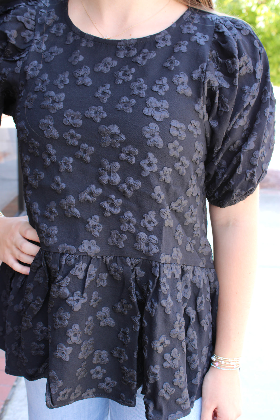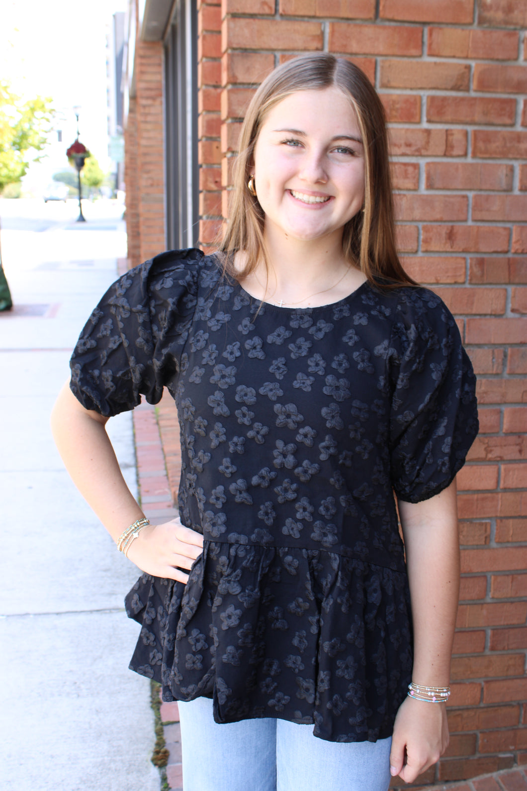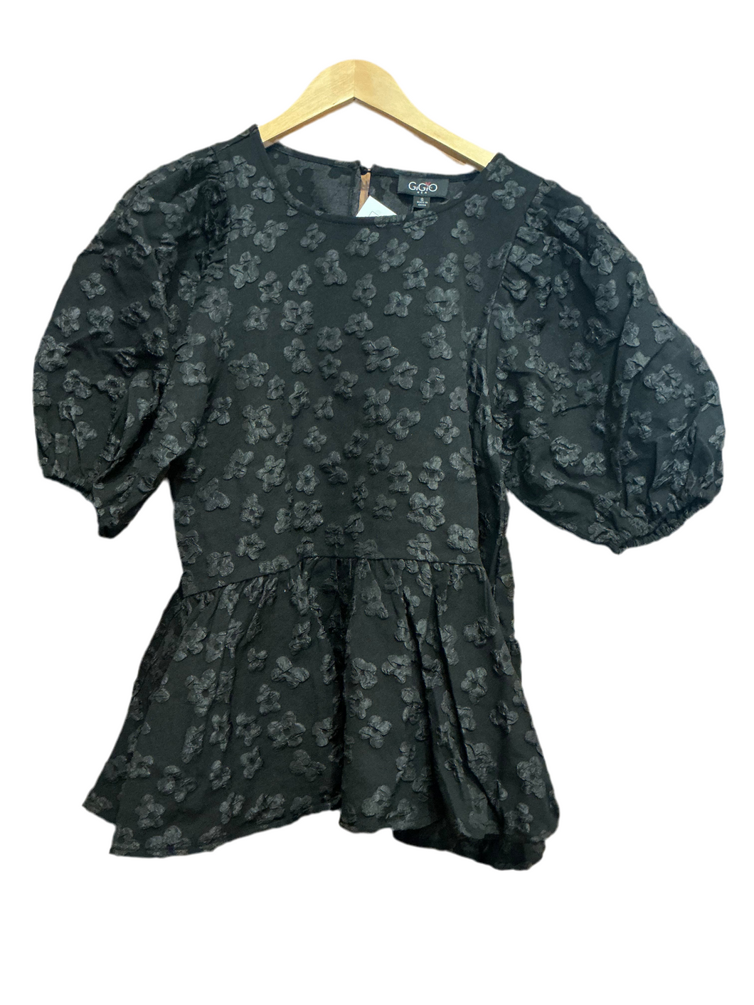 Black Rose Design Brocade 3/4 Sleeve Ruffle Top