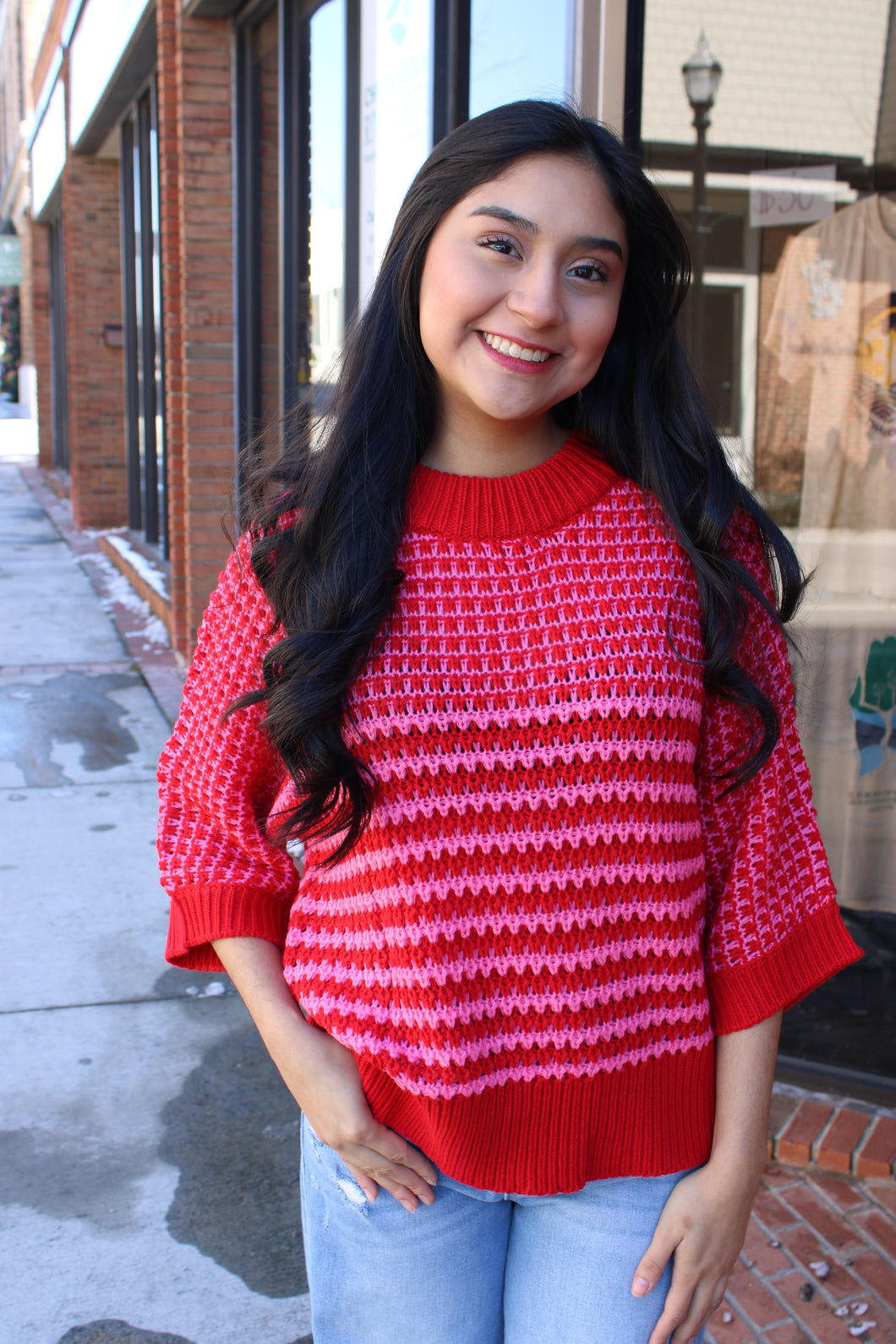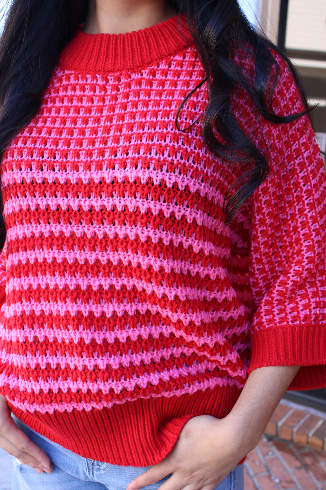 Red and pink with three quarter sleeve knit sweater