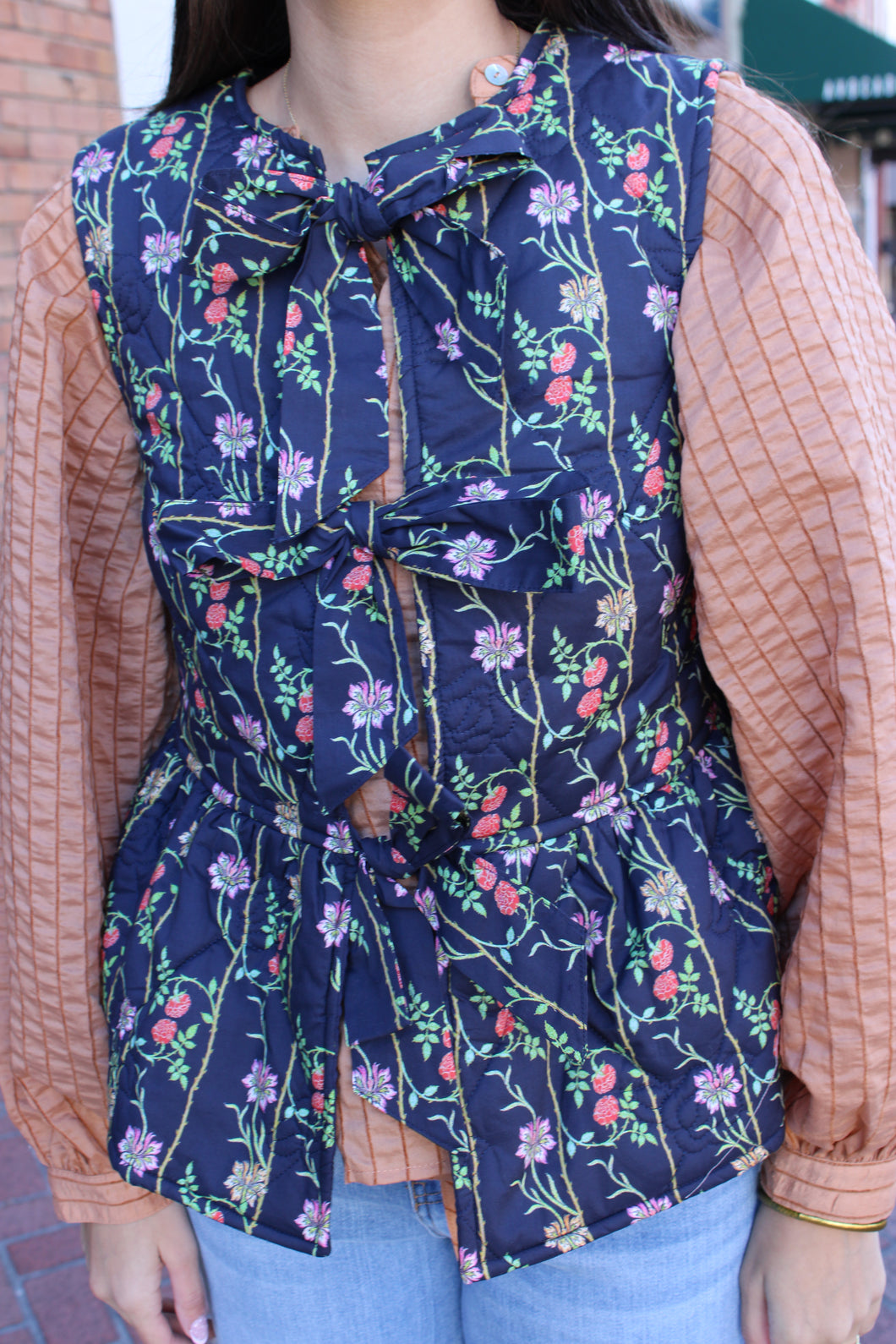 Blue with Floral and Cherry Design Tie Bow Front Vest