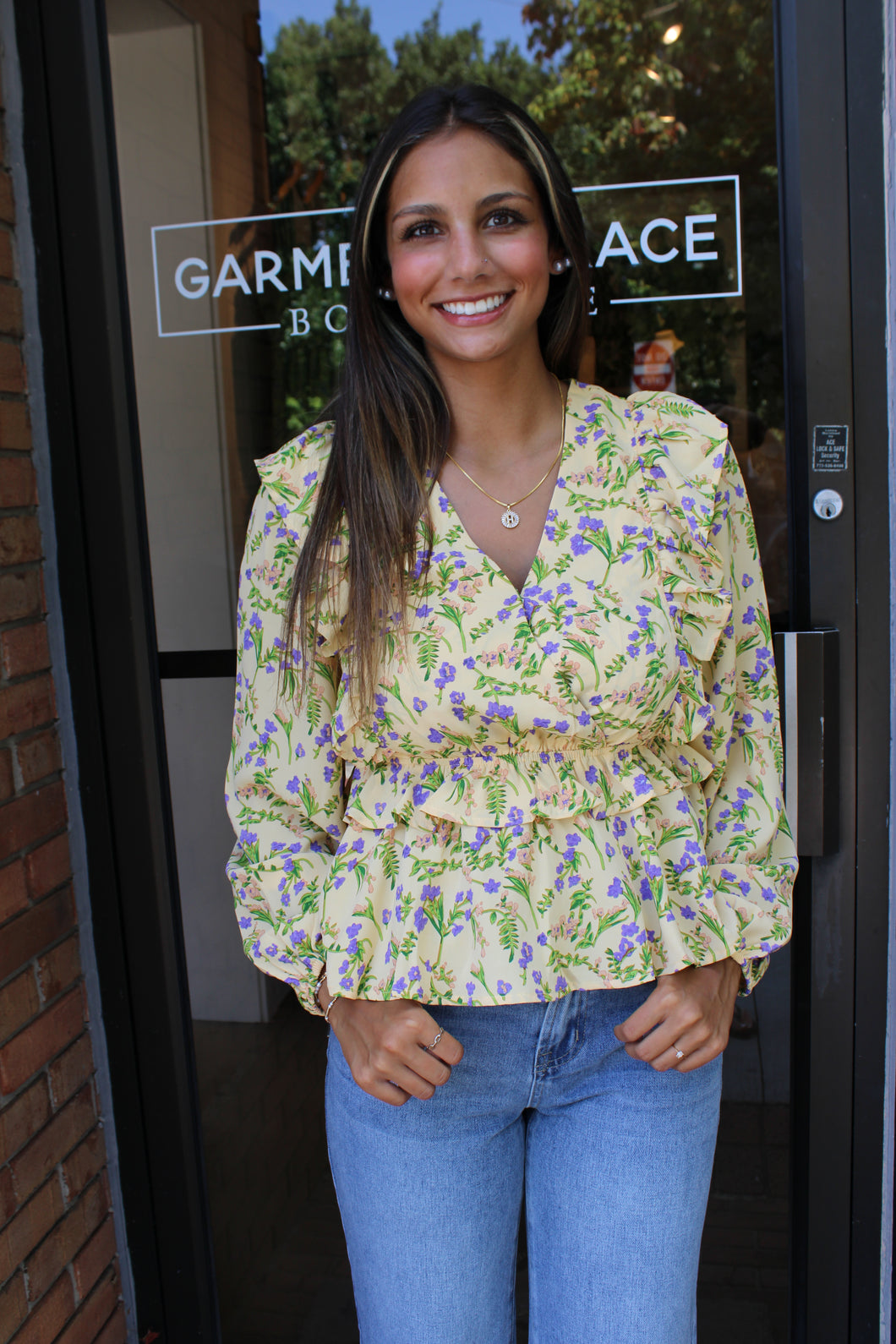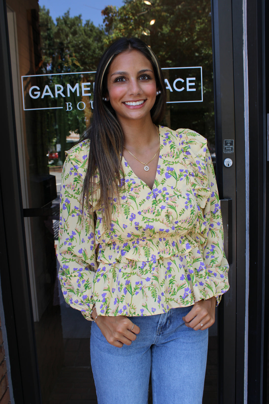 Pale Yellow Long Sleeve Top With Purple and Pink Flowers