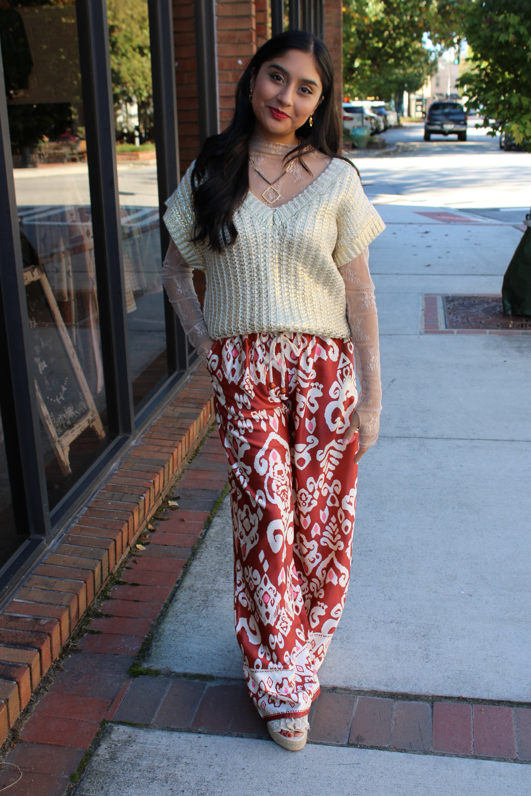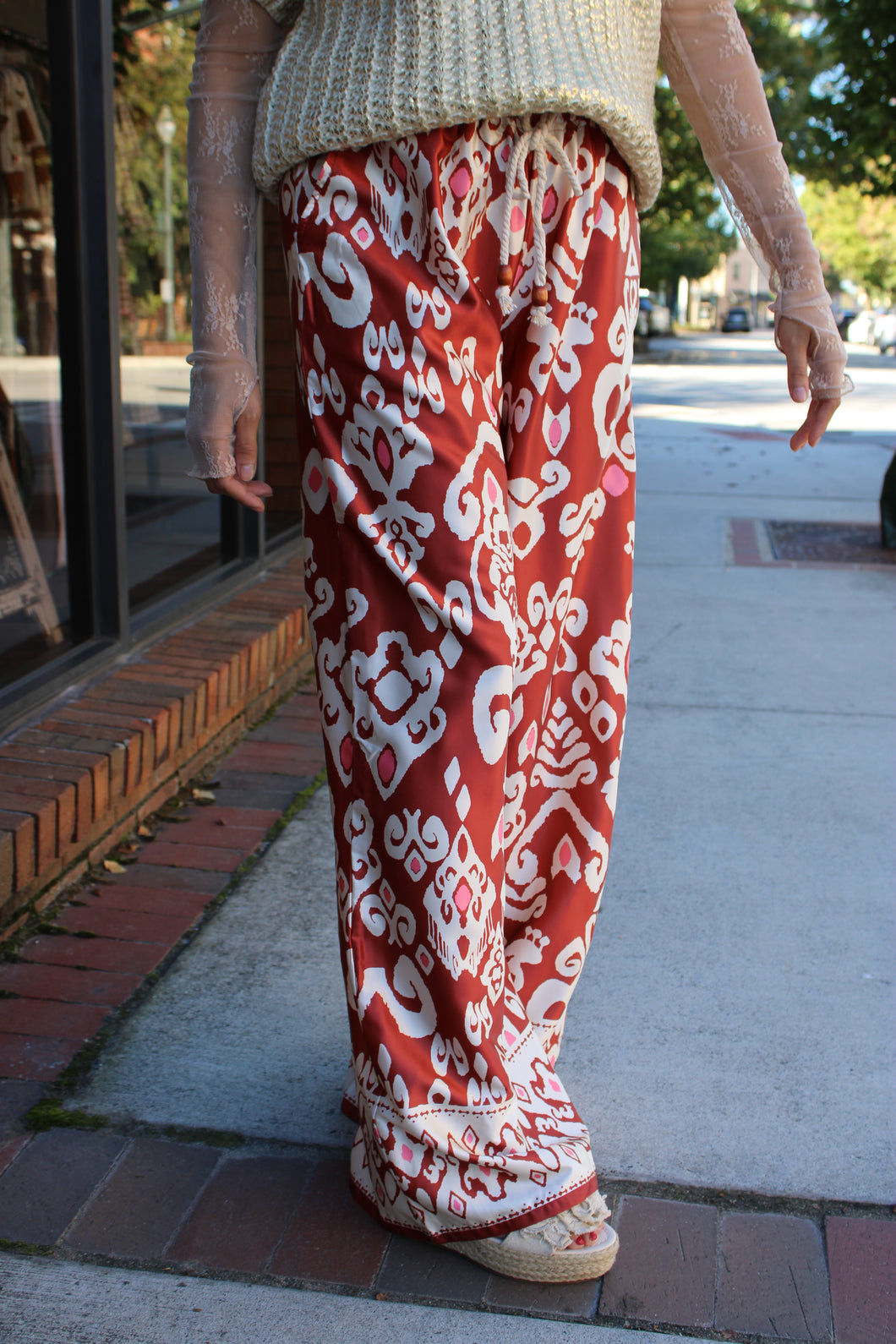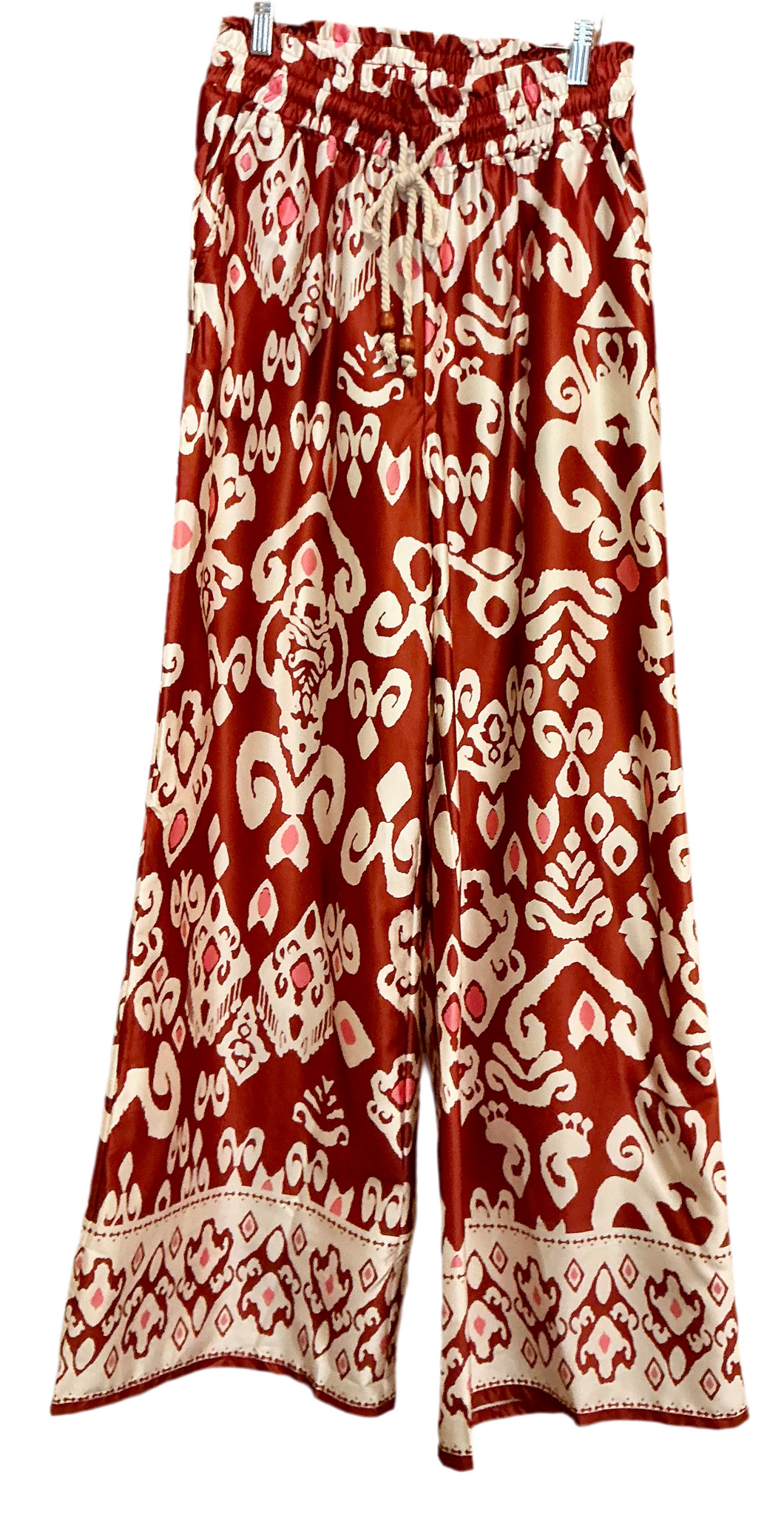 Rust with White and Pink Silk Paisley Print Wide Leg Pants