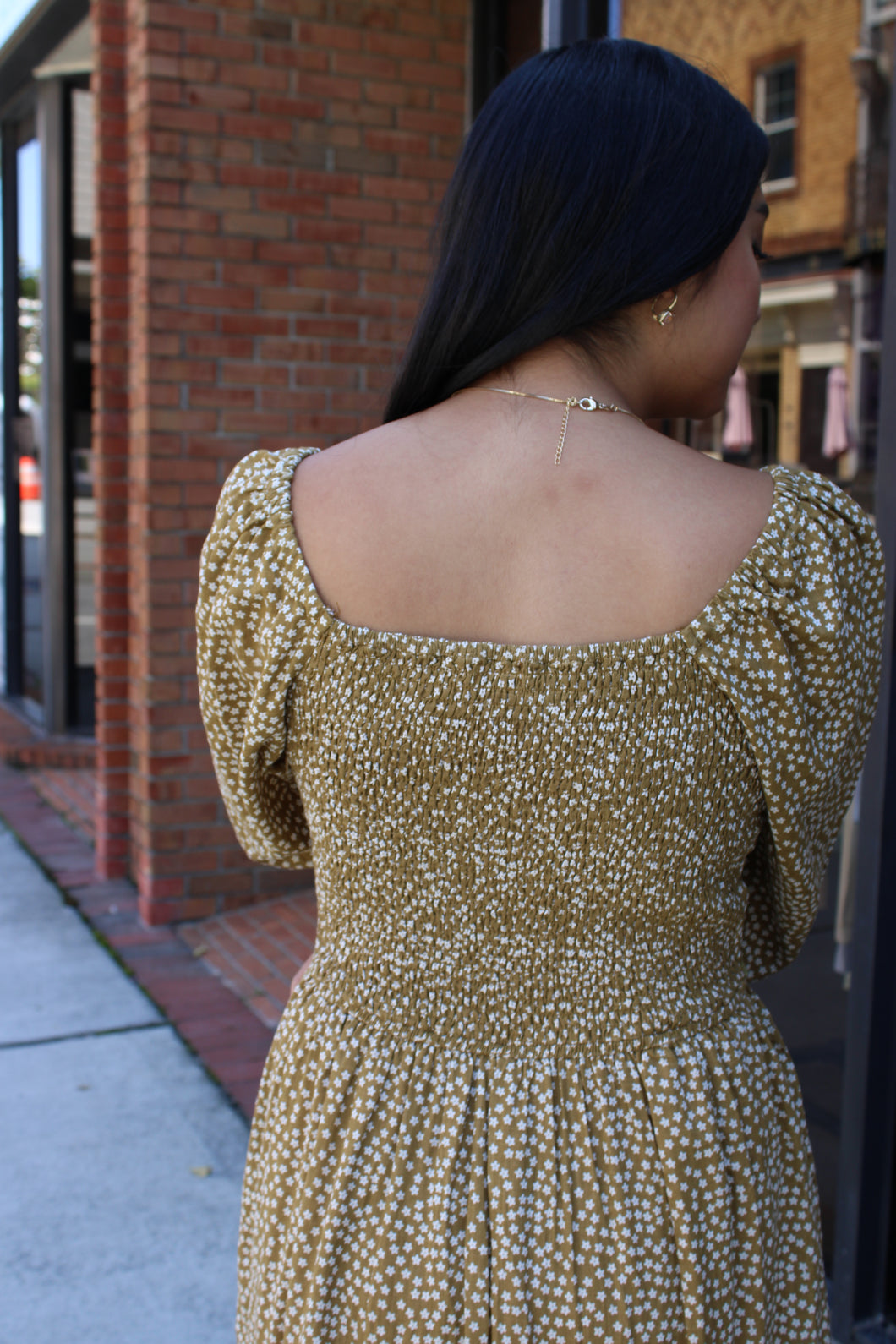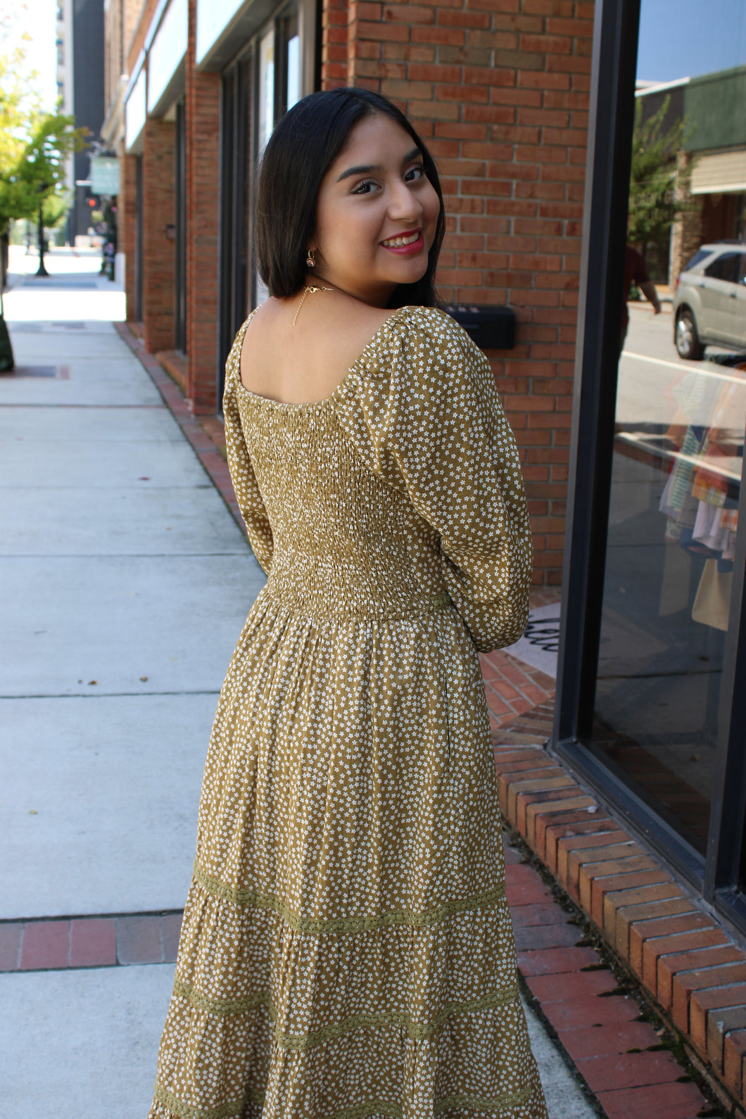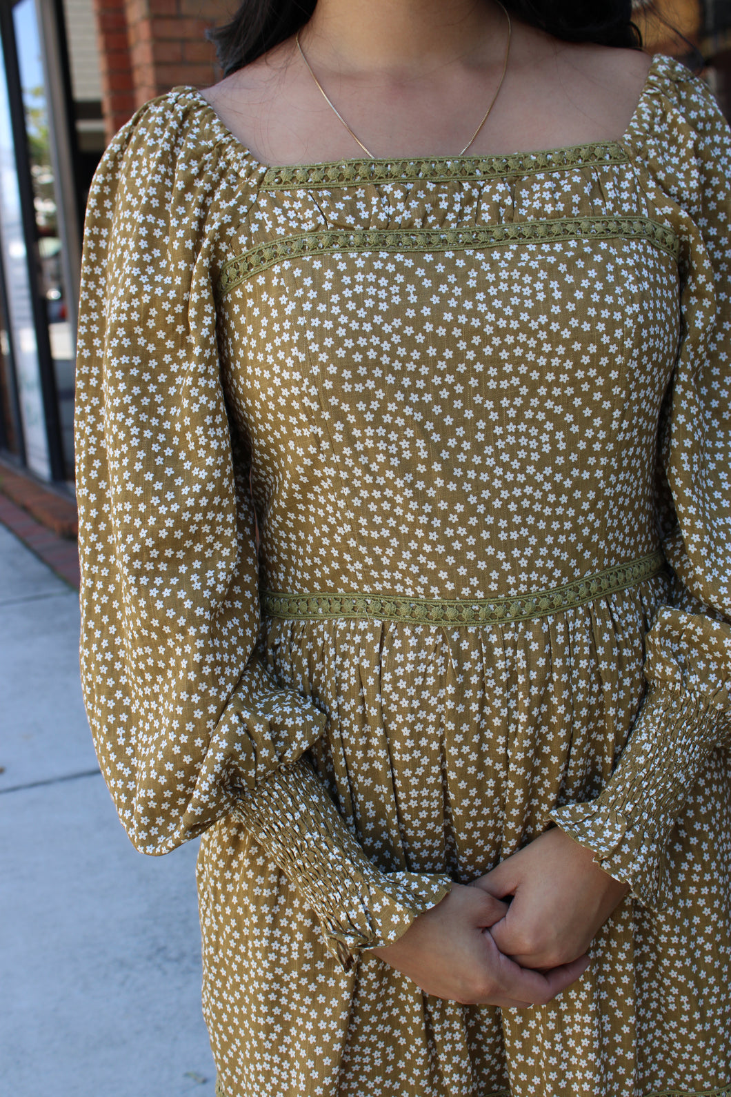 Mustard Brown with Dainty Cream Flowers Long Sleeve with Lace Detail Maxi Dress