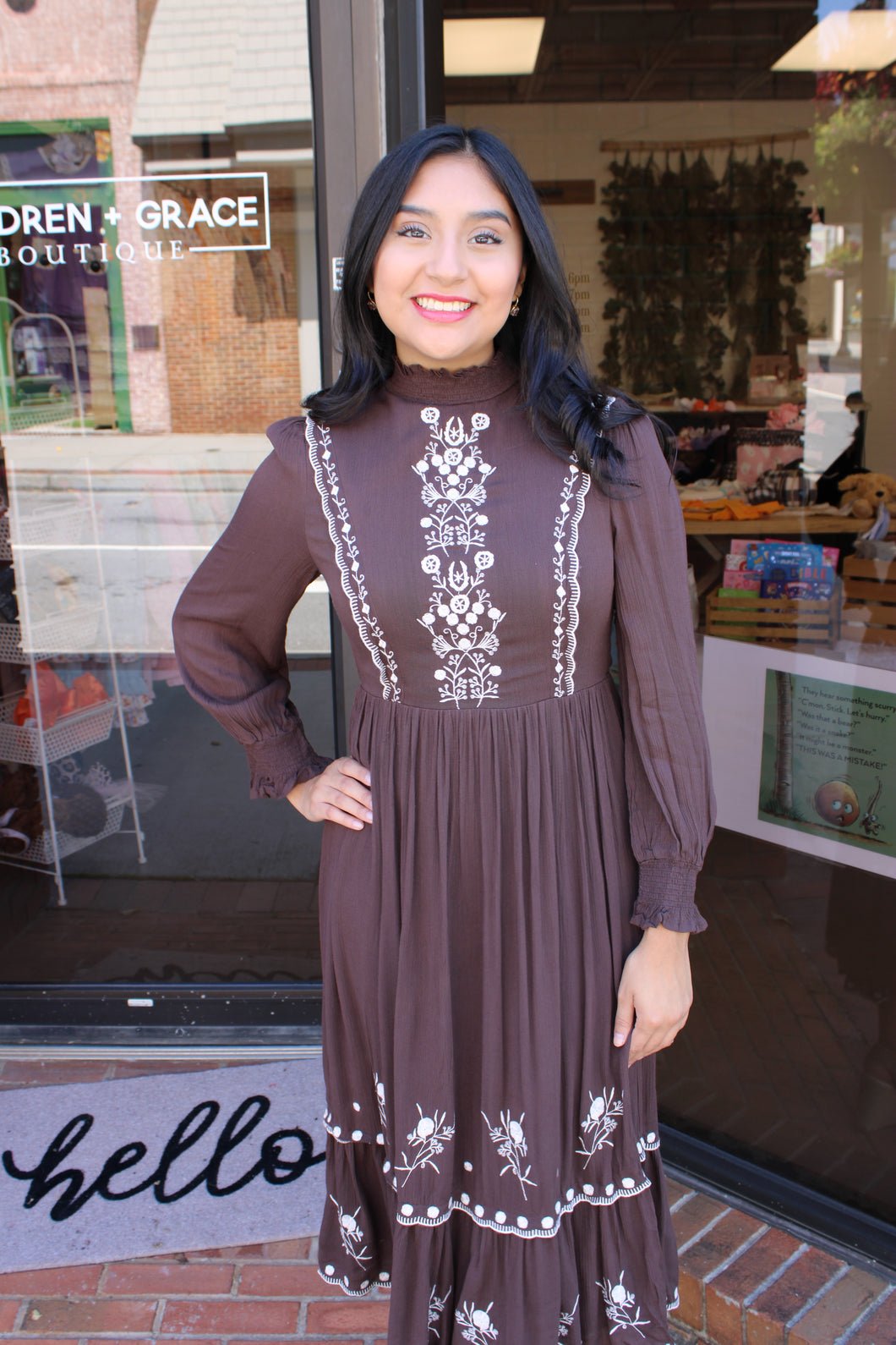 Brown with Cream Embroidery Stich Design Long Sleeve MIDI DRESS