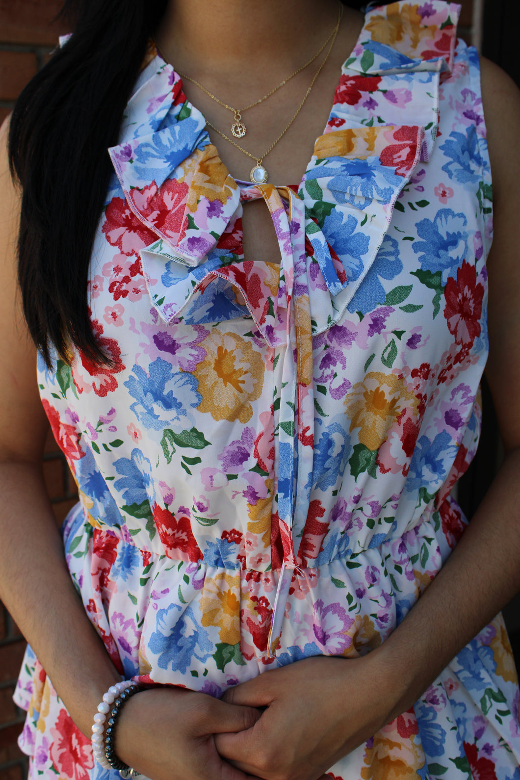 White Tie String Ruffle Neck With Multi Color Floral Ruffle Dress