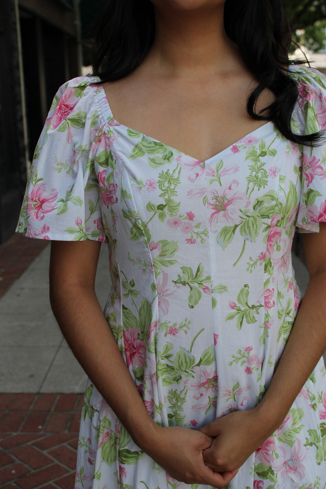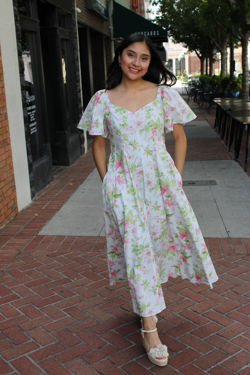 White With Pink and Green Floral Maxi Dress with Scallop Flutter Sleeve And Pockets
