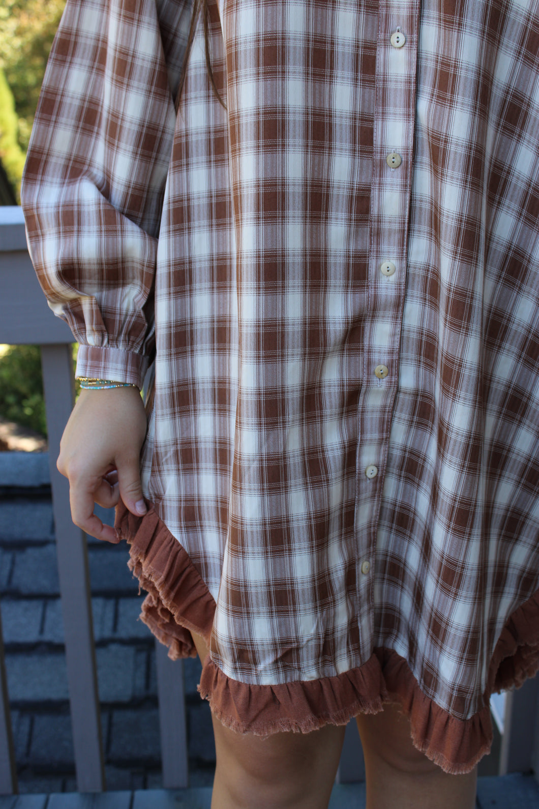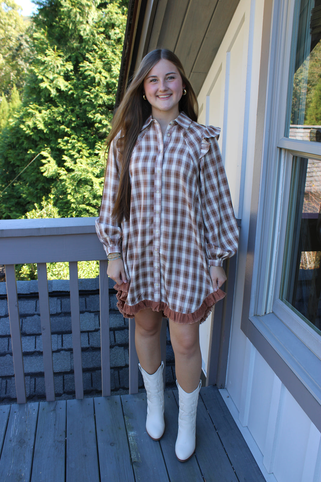 Tan and Cream Plaid Long Sleeve Ruffle Shoulder Button Down with Orange Ruffle Dress