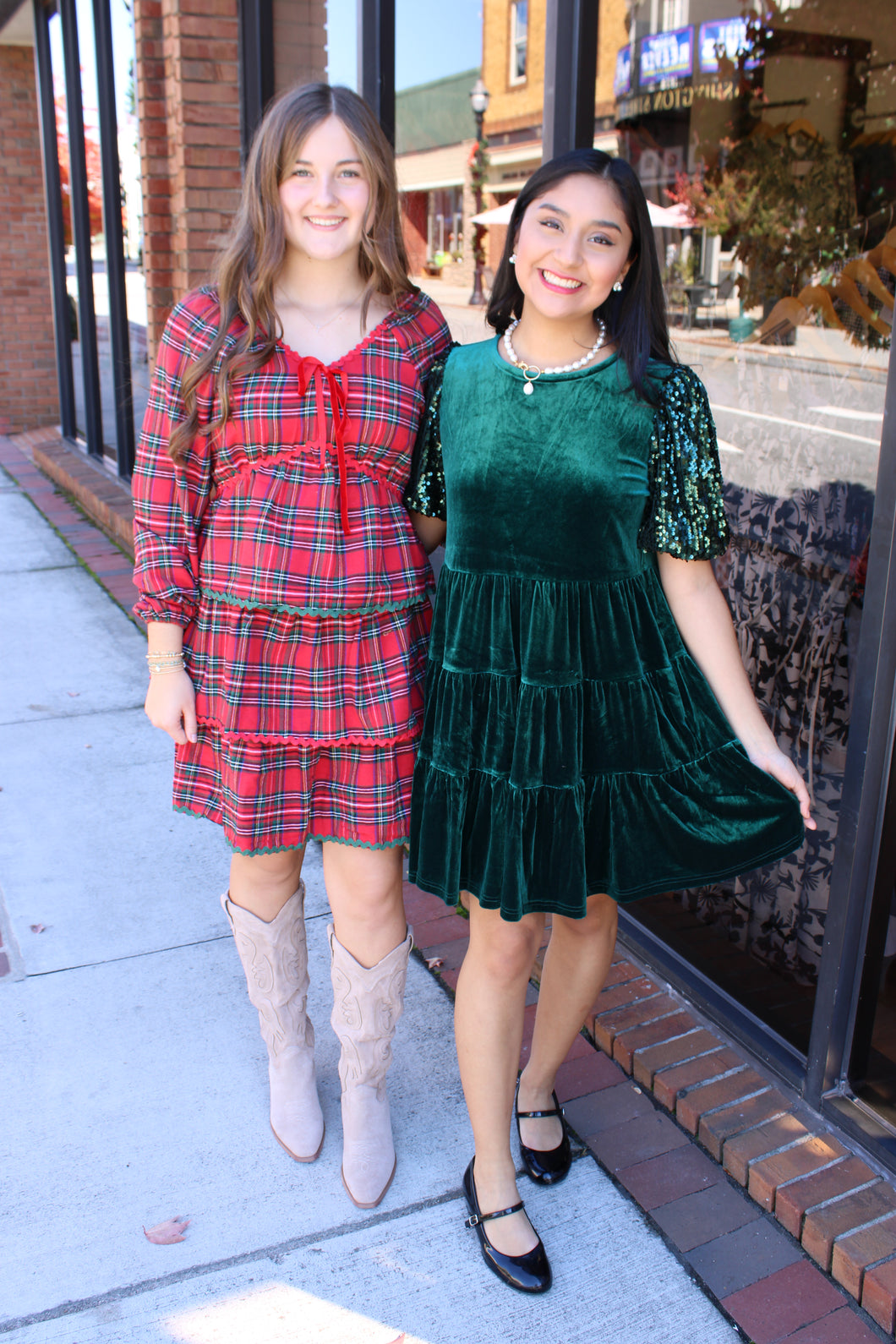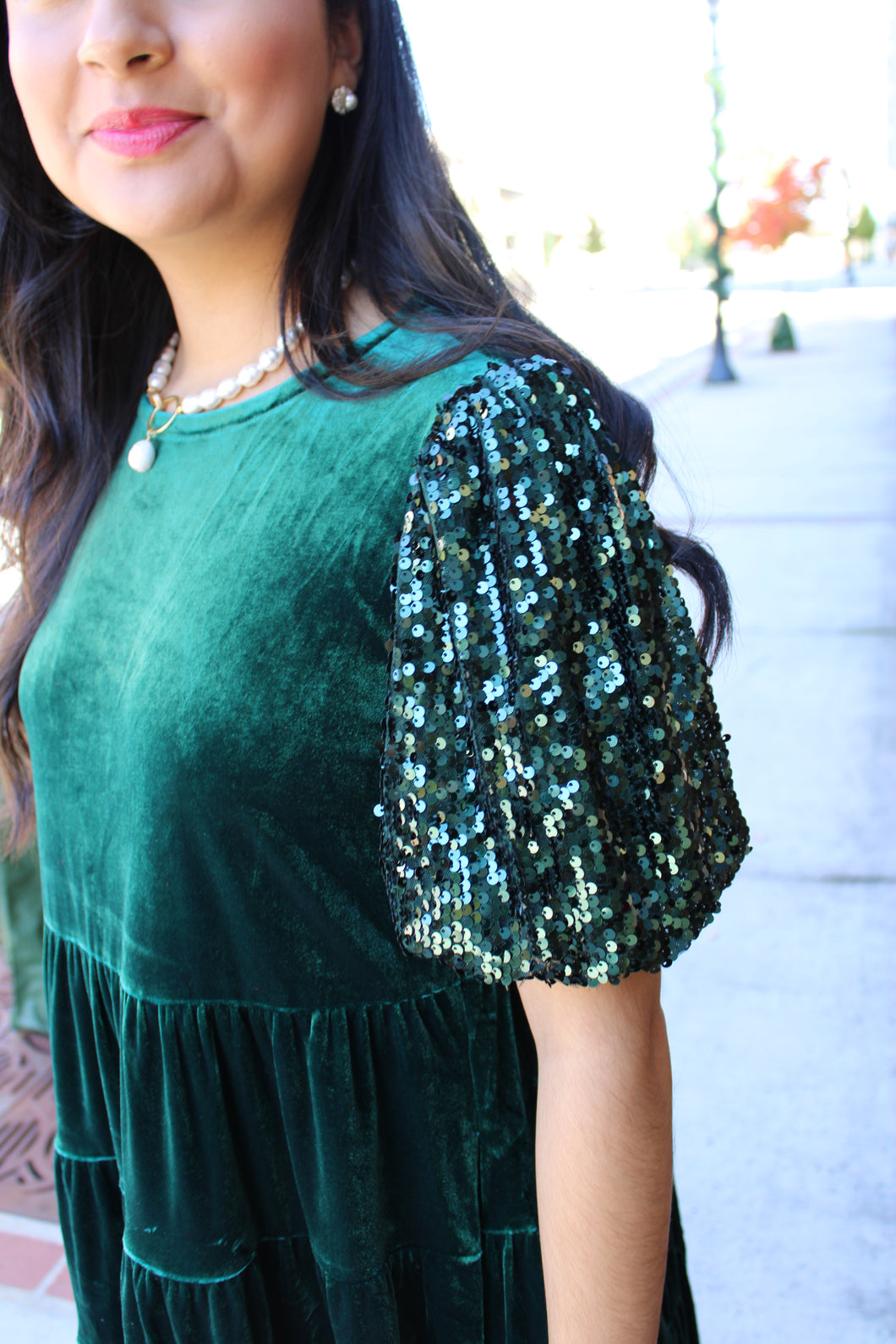 Emerald Green Velvet Mini Dress with Sequin Puff Sleeve