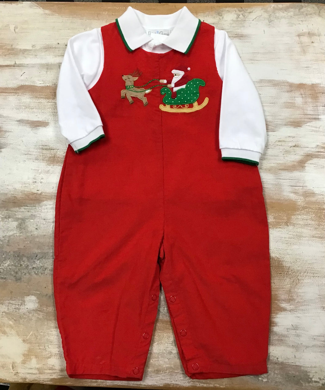 Red Corduroy JonJon with Long White Sleeve Shirt. Santa Claus Reindeer Sleigh Stitched